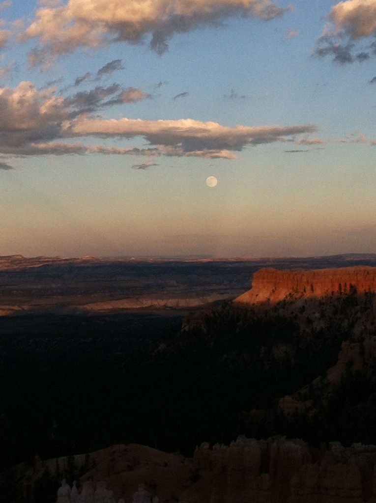 We met Leslie and Laurie to have dinner at the Lodge to celebrate Laurie’s birthday. Good times, and many laughs. We went back to change so we could be prepared to see the full moon from the rim trail. Unfortunately, clouds hampered our viewing experience. Besides seeing the moon for a split second when we first got there, it wasn’t until we returned to the hotel that the moon appeared. We said our goodbyes to Leslie and Laurie. They were moving on to Moab, and we were heading to Kanab in the morning.