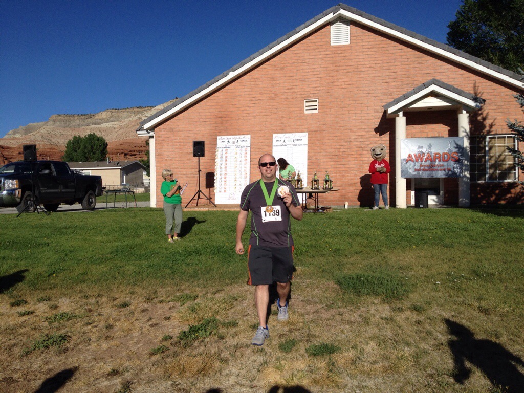 My alarm was set for 4:30. I woke up at 2:38. Race day. We needed to be past the one intersection before 5:30 as the half marathon began at 6. We picked up coffee, drove to Cannonville, parked, and wandered around the finish line area. Leslie joined the three 5k runners and offered to be the photographer. The race was perfect. I know that I was not ready to run a half marathon. The course was a simple out and back, but the scenery was inspiring. I had no way to know my pace as I had no cell reception and there were no mile markers. My pace was over a minute faster per mile than my last race. In fact, I placed third in my age group. (I’m conveniently leaving the total number of people in my age group out.) Laurie finished third in her age group, too!