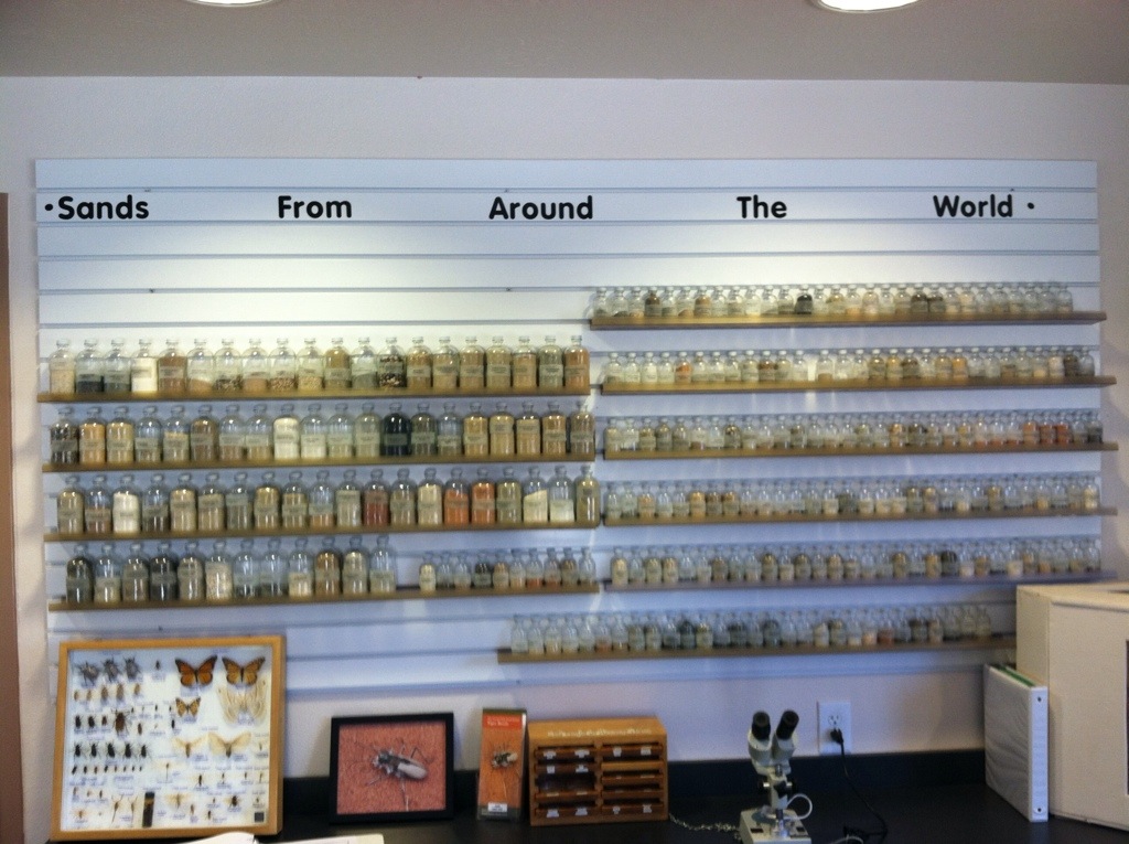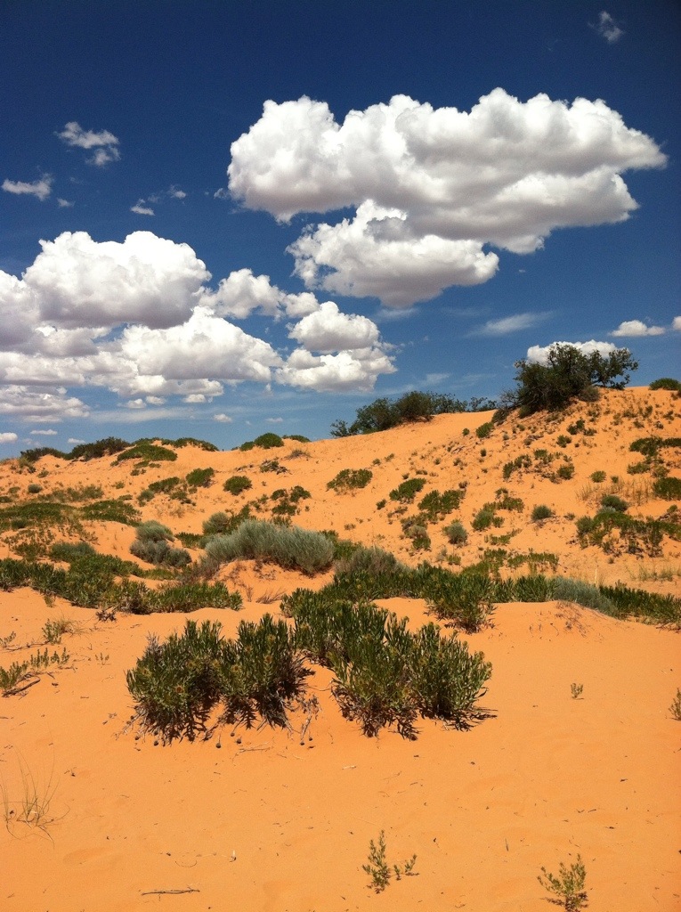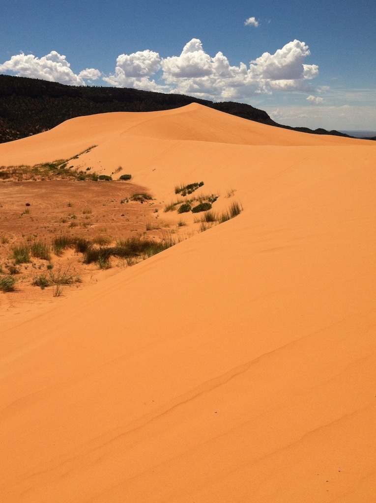 The real challenge now was to secure a 4 x 4 car to access the primitive and challenging 8.4 mile dirt road to the trailhead. Not an easy task on a Sunday in Utah. Ali placed a call to a local rental company, leaving a message on the voicemail. We then drove, excited and nervous, to a late morning hike in Coral Pink Sand Dunes SP. It was a pretty interesting, and very hot excursion. We stayed as long as the direct sun overhead would allow. We both took photos from every angle. On our way out, we saw sands from all over the world displayed at the visitor center. I was impressed by that wall.