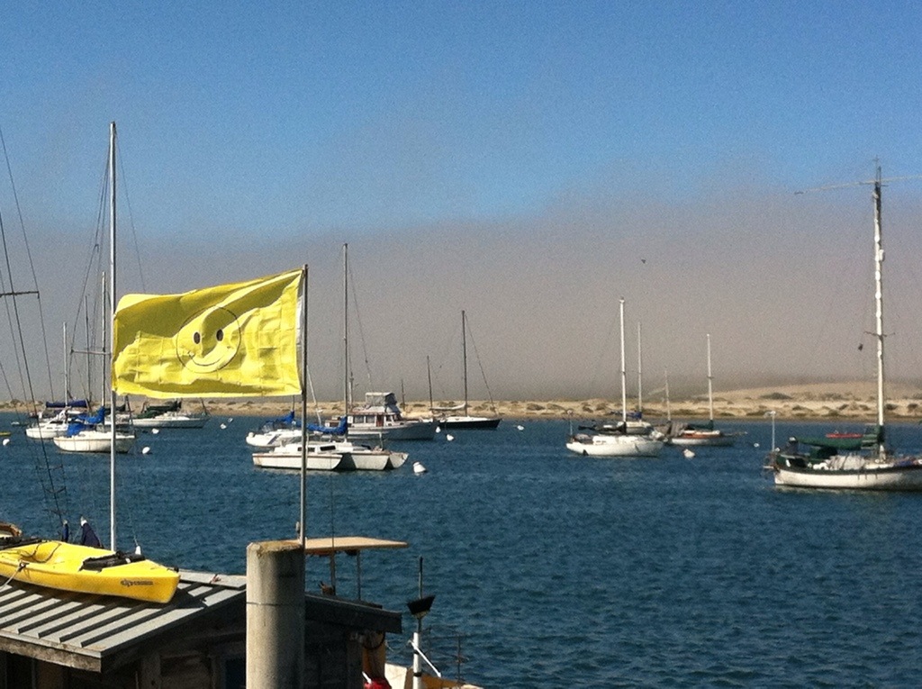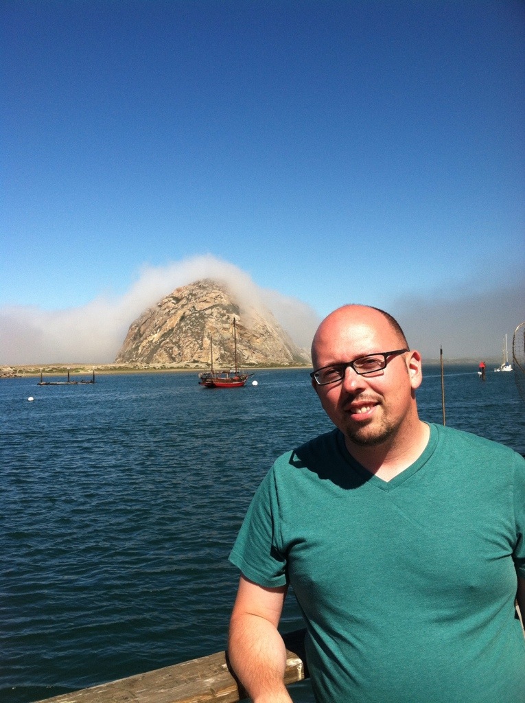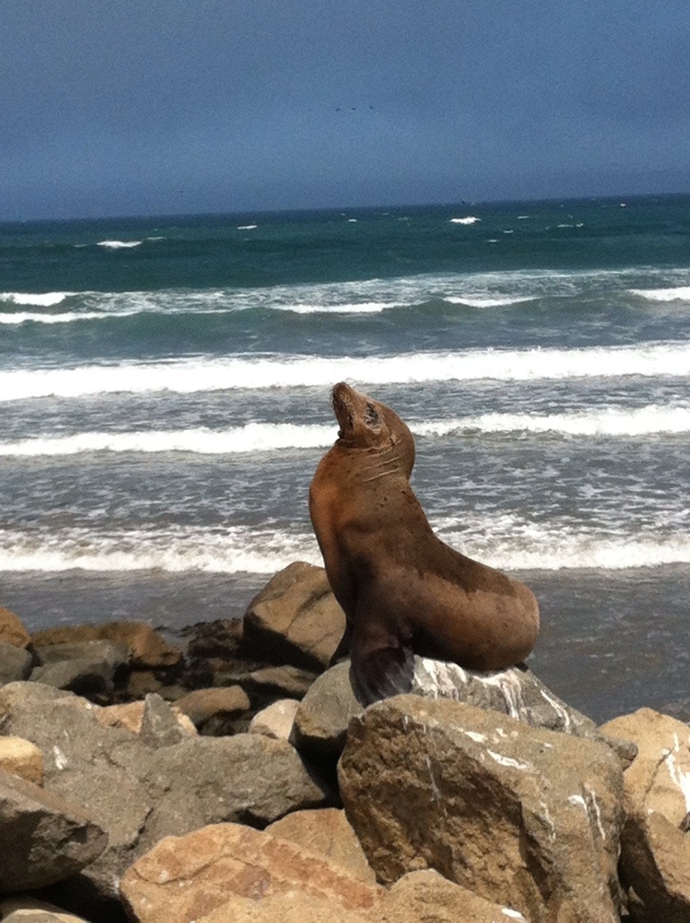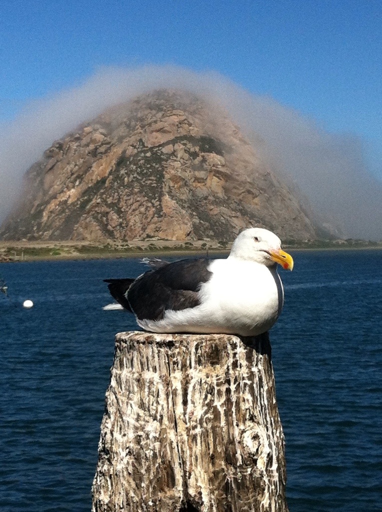 Departed the beach and began heading up the coast. Based on what I’ve heard people say, I decided to stop in Morro Bay. I’m so glad I did. Morro Rock was covered in a blanket of fog that was unlike anything I had ever seen before. Walked around the shops a bit, and visited a really eclectic little shop run by a sweet lady named Heather. I also visited a skateboard museum in town. On the docks, I chatted with a fisherman named Don. We talked awhile about fishing and traveling. I thought he’d be a good person to ask about fish tacos for lunch. He told me to drive to the next town for his favorite place. Before doing so, I drove to the base of the Morro and met a local friend sitting on the rocks.