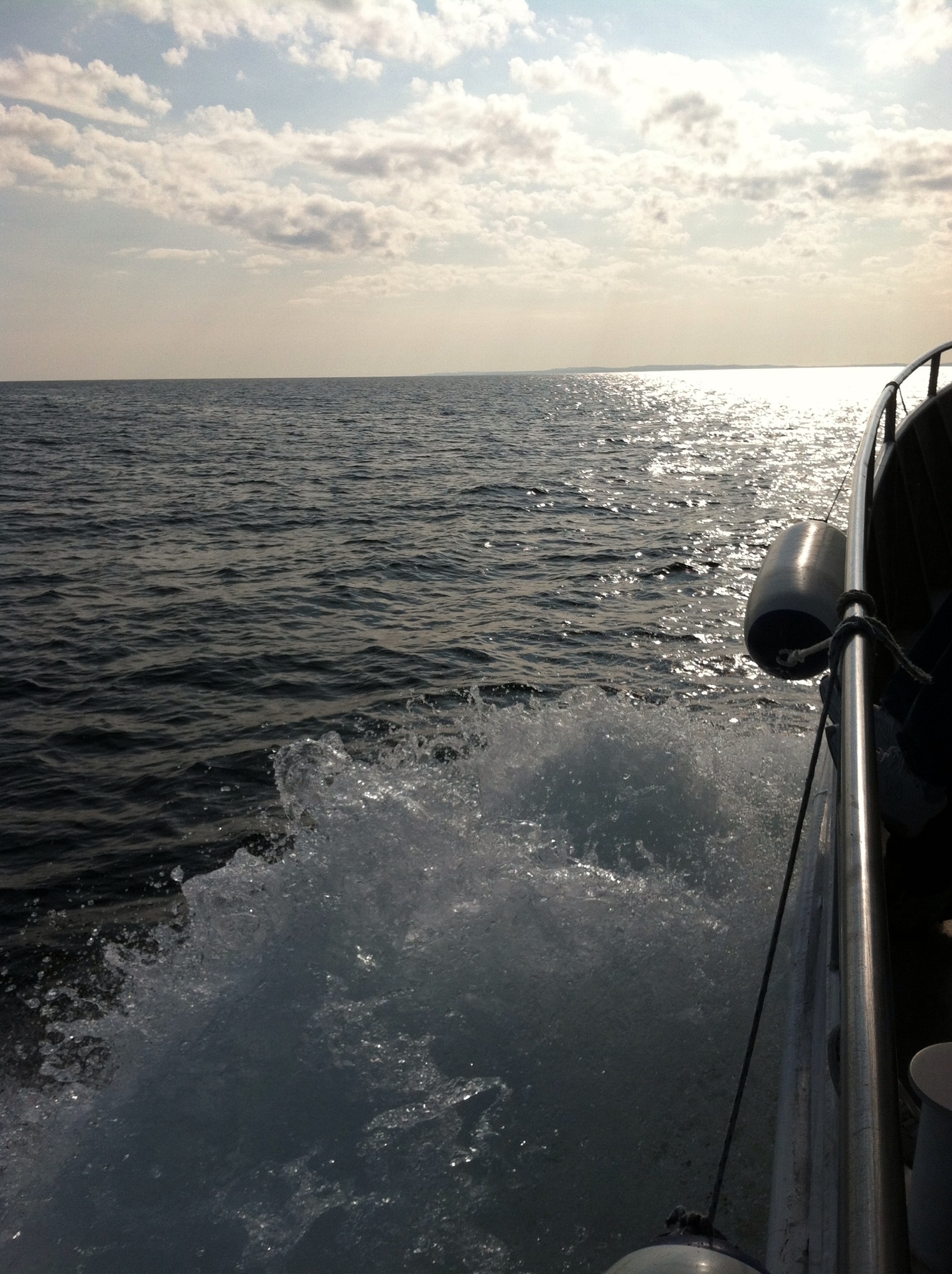 On the return trip, I sat at the front of the boat with Joe and Jan, a guy who had just spent a week camping on the island, and another couple. At first the breeze was nice, and occasionally we got a light spray of water. Jan and I had a really nice conversation about teaching and books. We both laughed about how sixth grade teachers are a special breed of teachers and people. Along the way, the wind and waves picked up. We were all SOAKED! The belly laughs that followed were just wonderful. With about thirty minutes left, I retreated inside. I’m glad I did, as the waves continued to increase. There were major whitecaps in the middle of Lake Superior. After docking, I shared a roll of paper towels with my new friends, and changed into dry clothes before crossing the border into Canada.