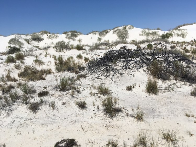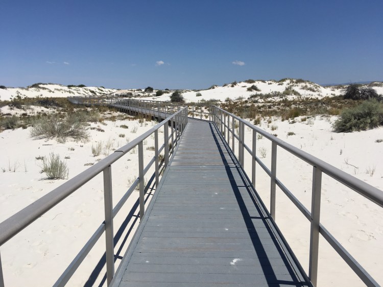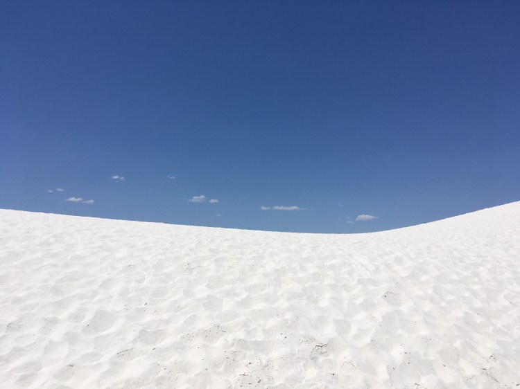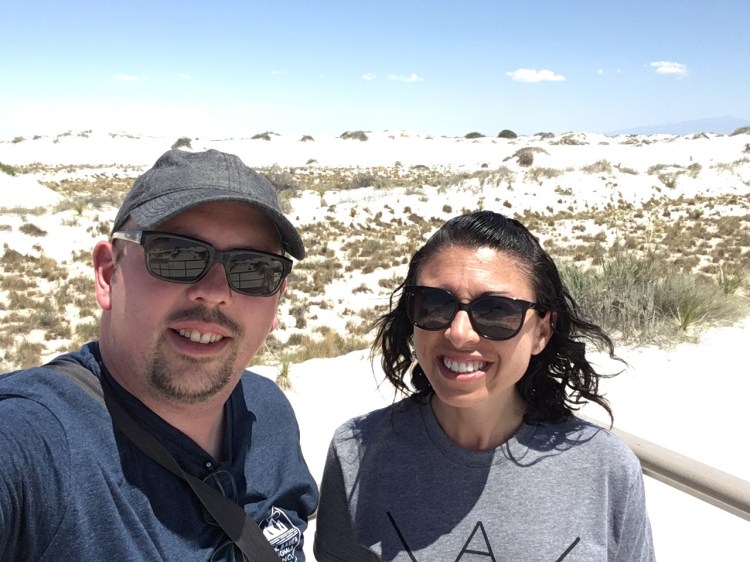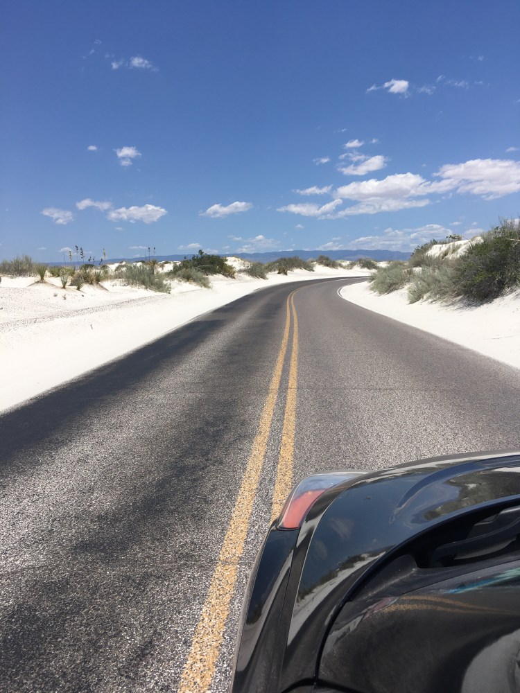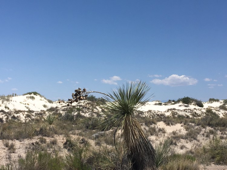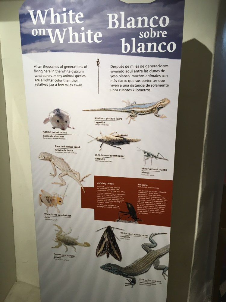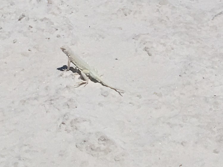 :  We woke up and broke down camp before making our way towards White Sands National Monument.  This won out over passing through Roswell, NM.  I’m so glad it did!  The hour or two we spent there was fascinating.  We drove along roads that were covered by the white sand, which is actually finely eroded gypsum.  We climbed the dunes and saw incredible views.  Janice met a spider friend who wanted to hang out in her shadow, while I met a lizard friend who was showing off his highly evolved sense of camouflage.