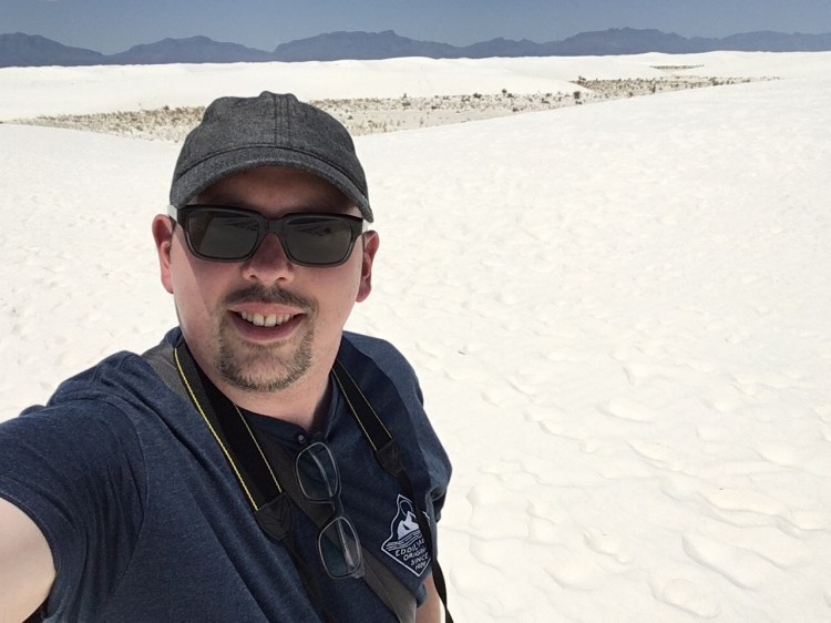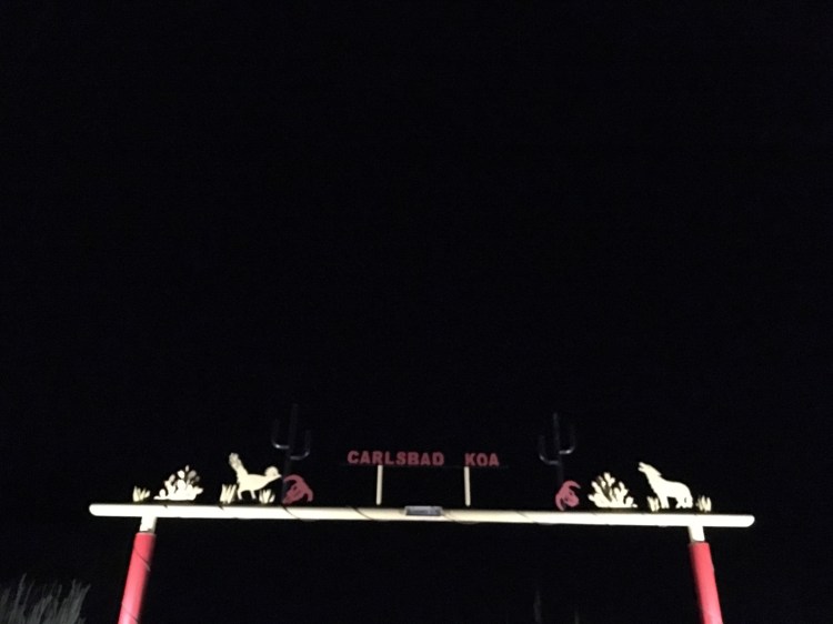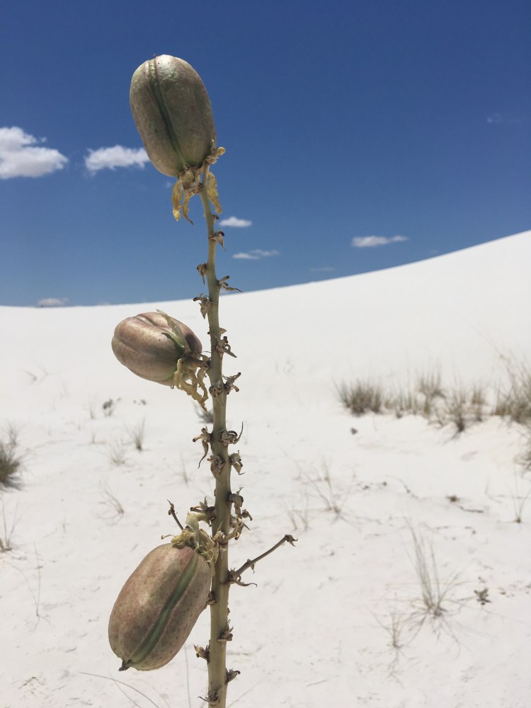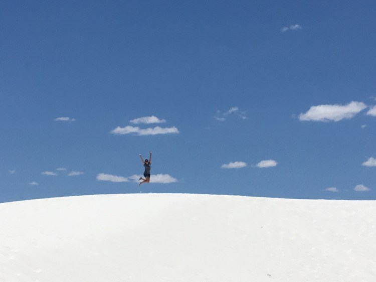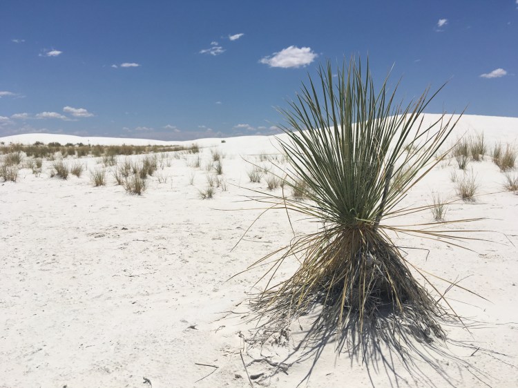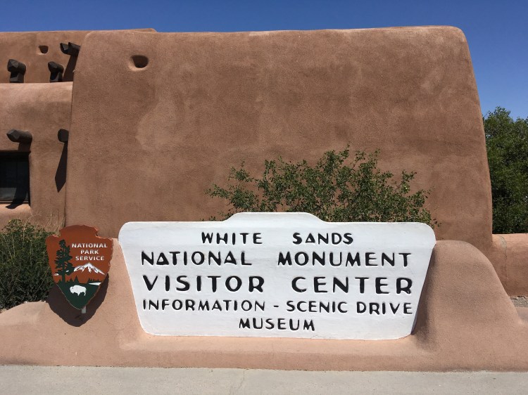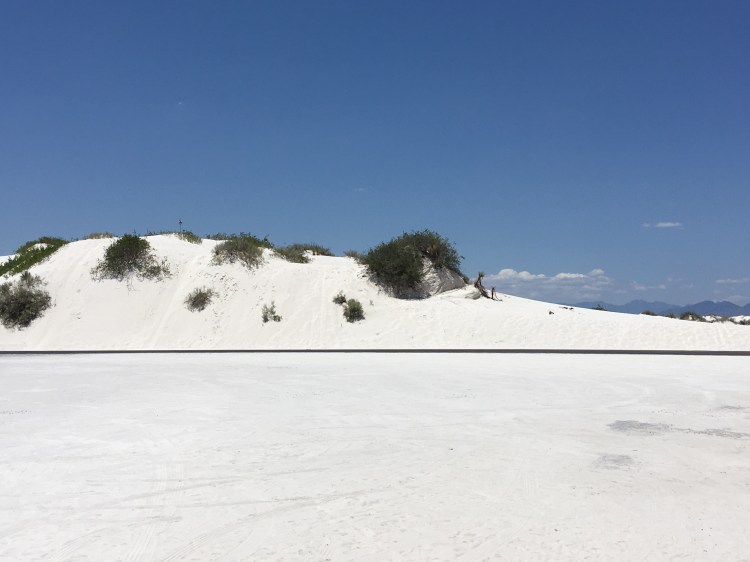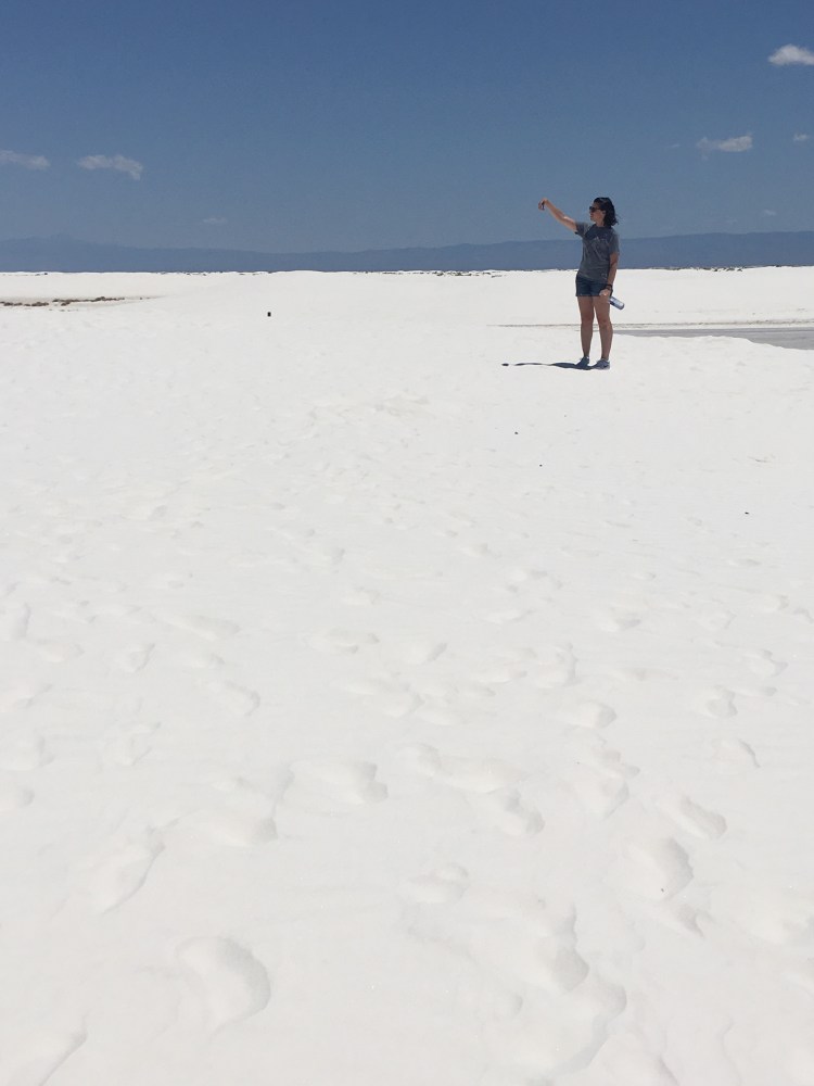 :  We woke up and broke down camp before making our way towards White Sands National Monument.  This won out over passing through Roswell, NM.  I’m so glad it did!  The hour or two we spent there was fascinating.  We drove along roads that were covered by the white sand, which is actually finely eroded gypsum.  We climbed the dunes and saw incredible views.  Janice met a spider friend who wanted to hang out in her shadow, while I met a lizard friend who was showing off his highly evolved sense of camouflage.