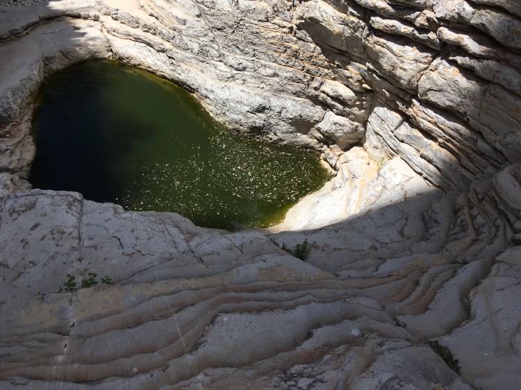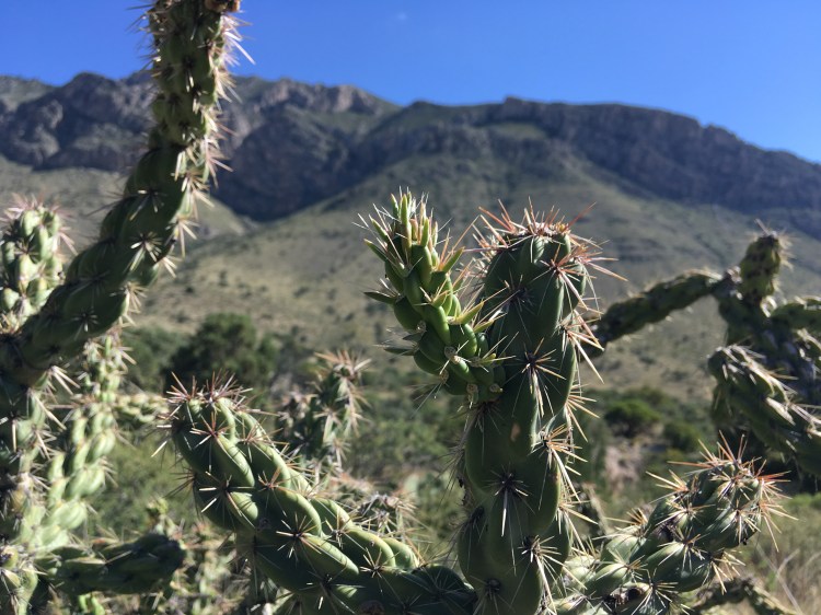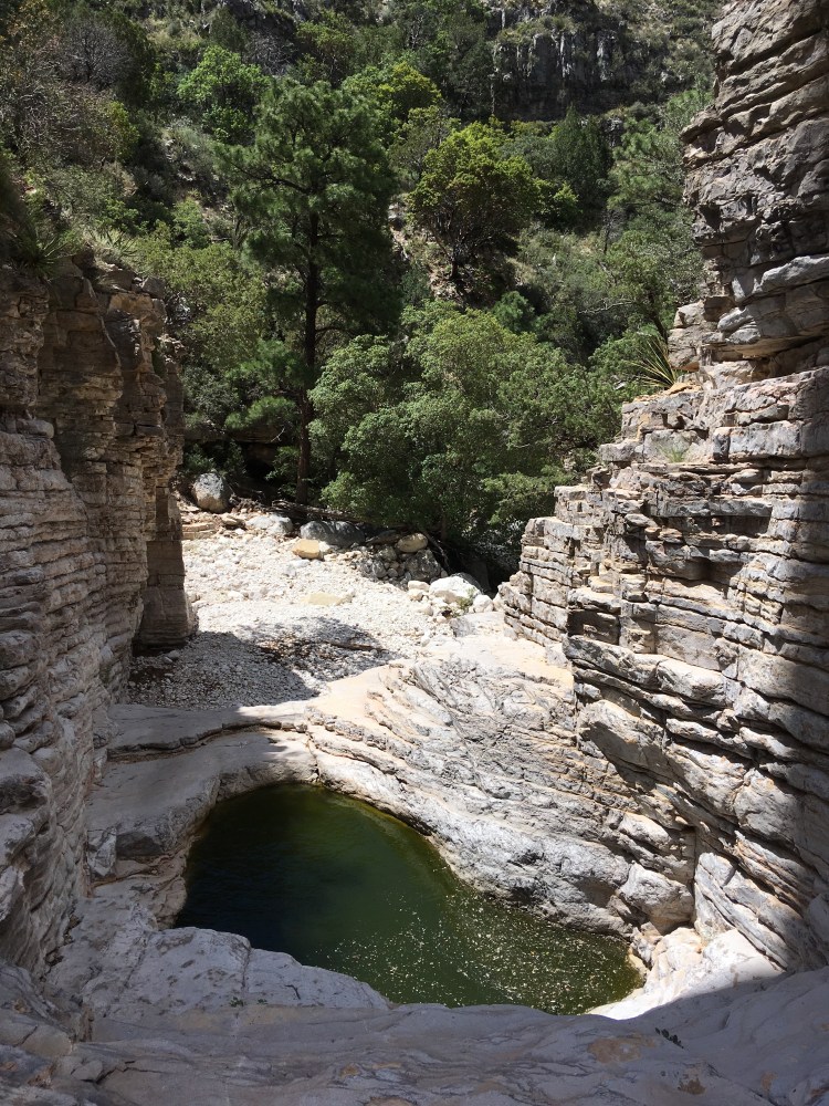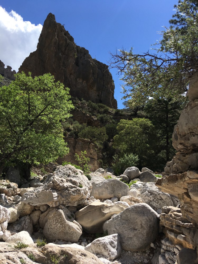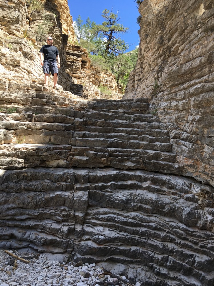 We drove a little over an hour southbound back into Texas to visit Guadalupe Mountains National Park.  (Another new NP for me.)  After filling our water bottles and getting a map at the visitor’s center, we began our 5+ mile hike to Devil’s Hall.  The hike was a basic out and back trek.  The first part of the hike was on a traditional trail which gained some elevation.  The second part of the hike had us walking through a rocky wash and scrambling over rocks and boulders.   Luckily, I had two hiking poles.  We were both able to use one to help us remain steady.  At the end of the way in, we approached a natural staircase which led to the trail’s namesake.  We snapped several photos, ate a snack, and turned around to hike back down.
