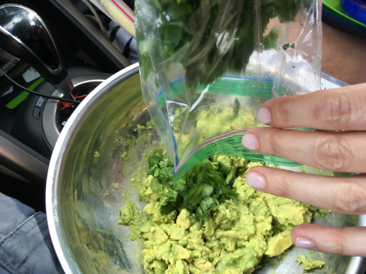 Back in my car, we prepared our dinner.  I’m getting much better at making “car guacamole” with success, after having practiced the skill at Red Rocks two years ago.  The trick is to cut everything but the avocados earlier and keep the parts in separate bags.
