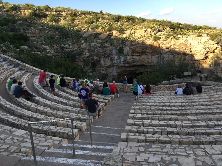 Our National Park day concluded with us listening to a ranger speak about the Brazilian Freetailed bats who reside in the cave for several months of the year.  He spoke until the bats emerged in the hundreds of thousands.  There are no photos of the actual bat flight, as the electronics can have a negative effect on the bats.  (An armed police officer is there to make sure everyone complies.  Presumably, one will get shot if you dare to snap a photo.)