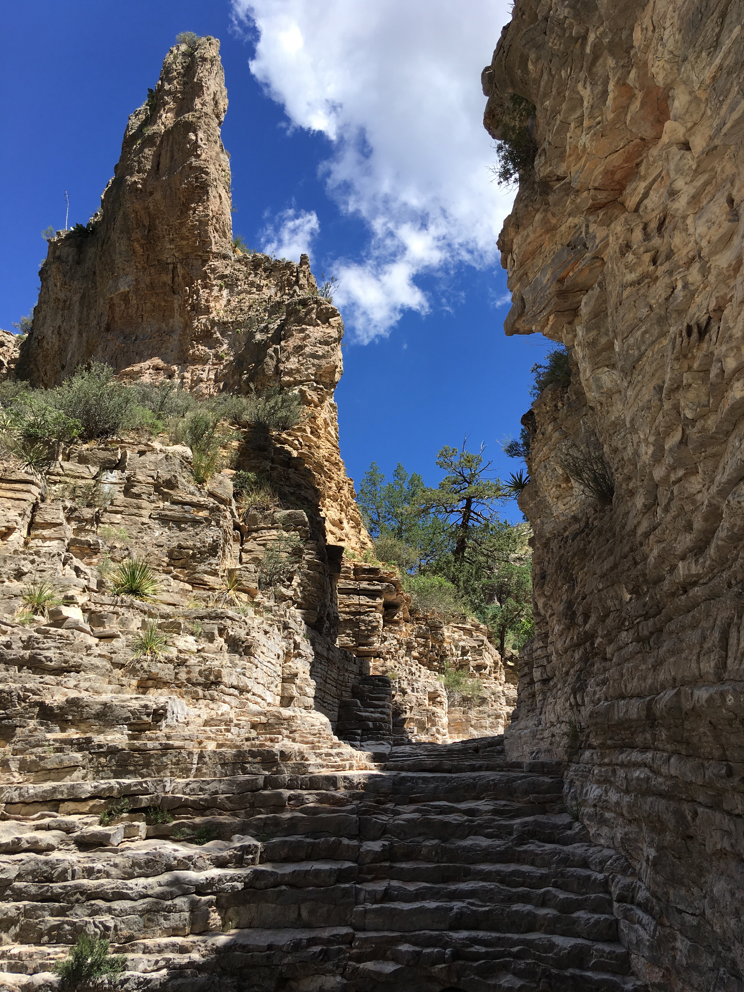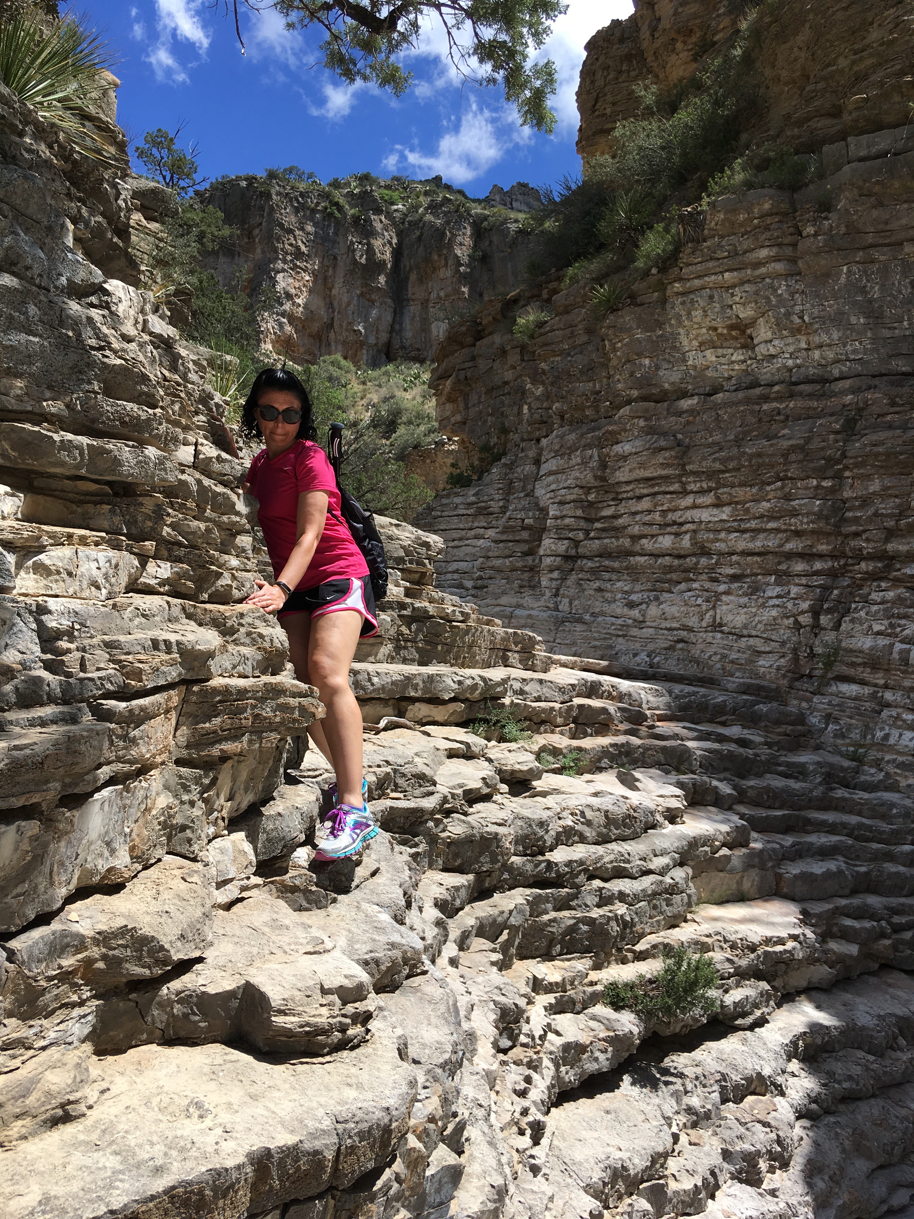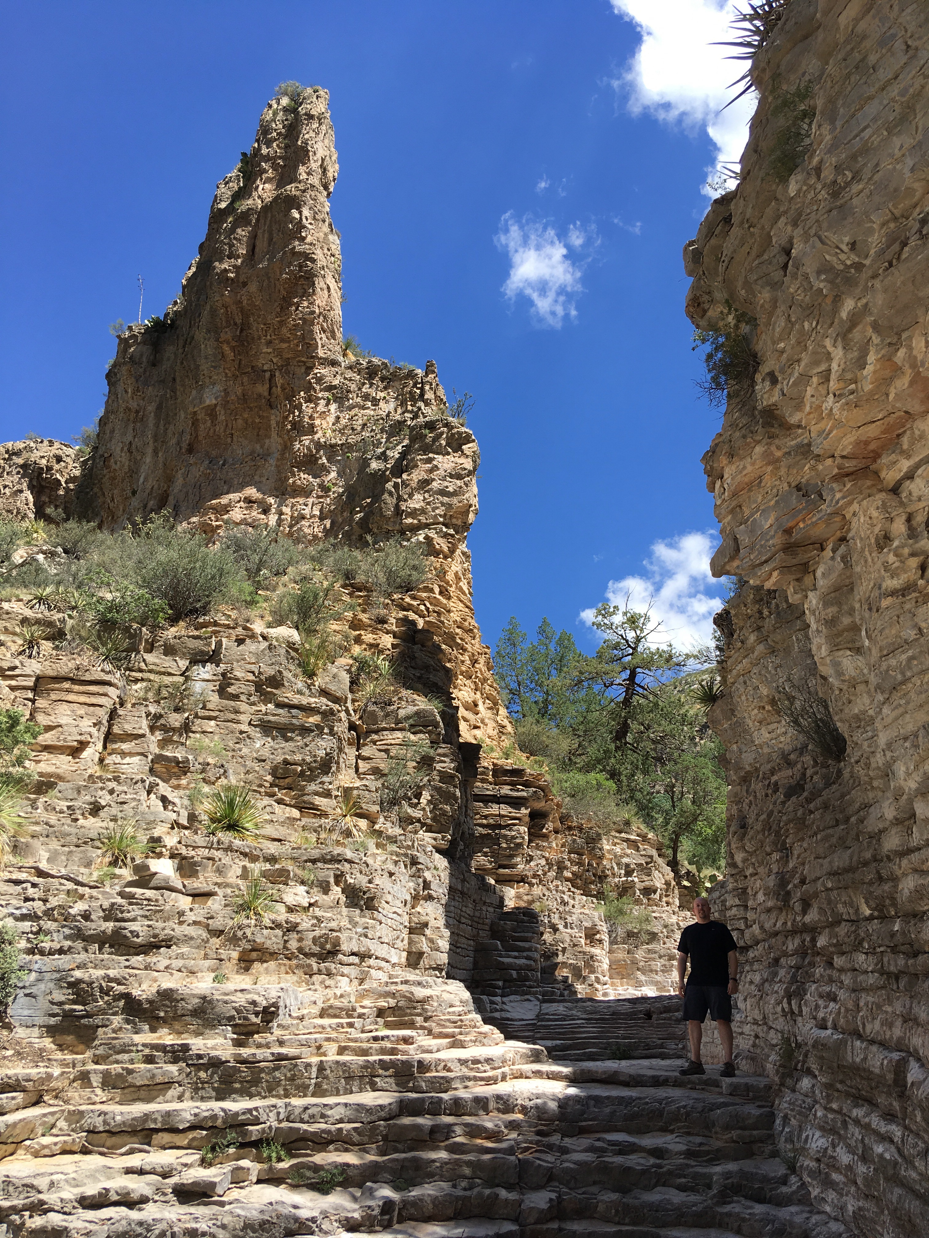 We drove a little over an hour southbound back into Texas to visit Guadalupe Mountains National Park.  (Another new NP for me.)  After filling our water bottles and getting a map at the visitor’s center, we began our 5+ mile hike to Devil’s Hall.  The hike was a basic out and back trek.  The first part of the hike was on a traditional trail which gained some elevation.  The second part of the hike had us walking through a rocky wash and scrambling over rocks and boulders.   Luckily, I had two hiking poles.  We were both able to use one to help us remain steady.  At the end of the way in, we approached a natural staircase which led to the trail’s namesake.  We snapped several photos, ate a snack, and turned around to hike back down.