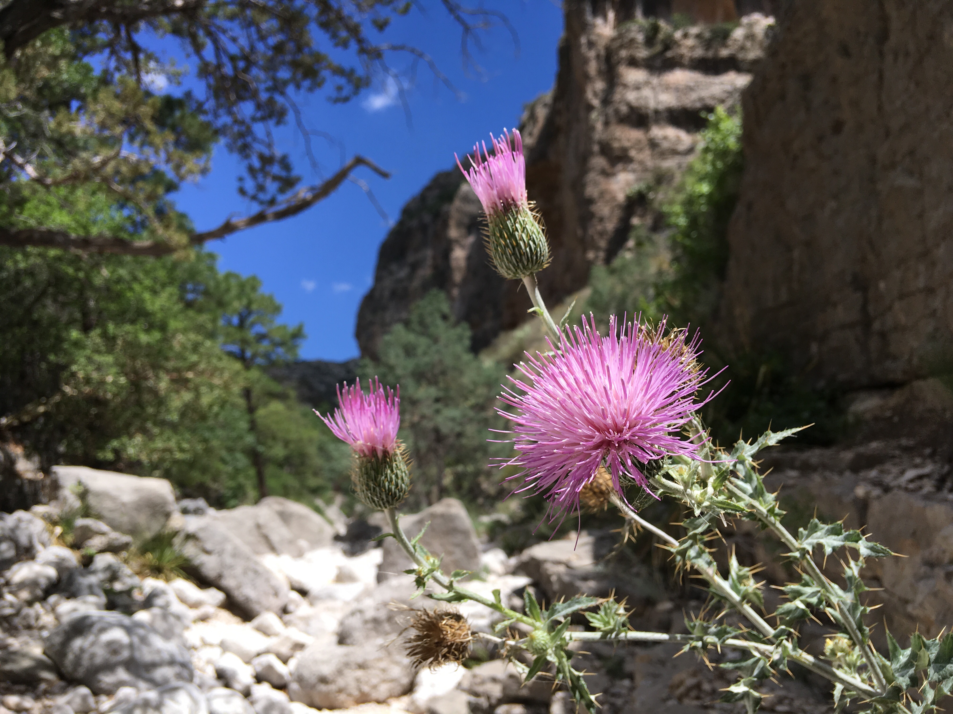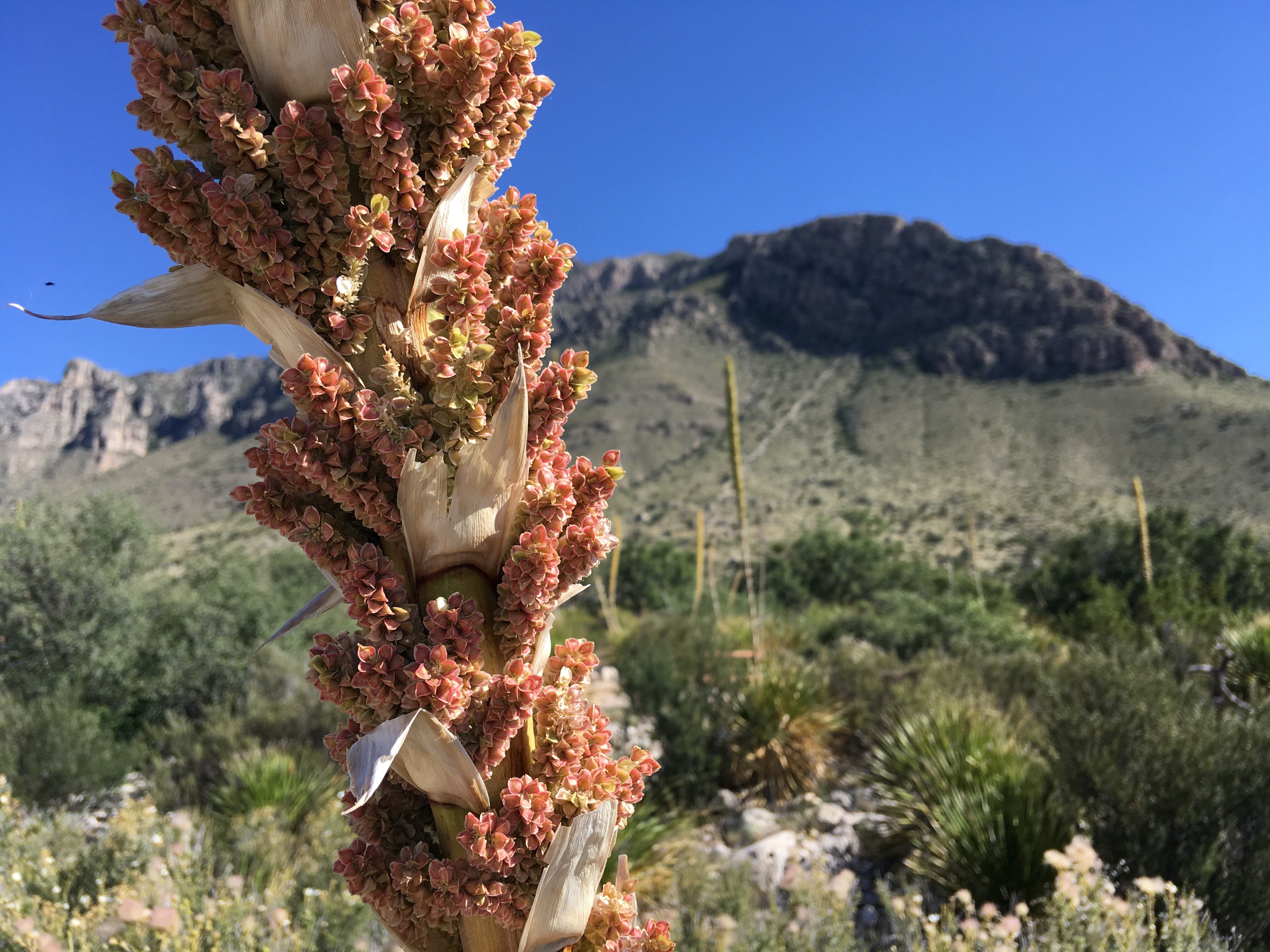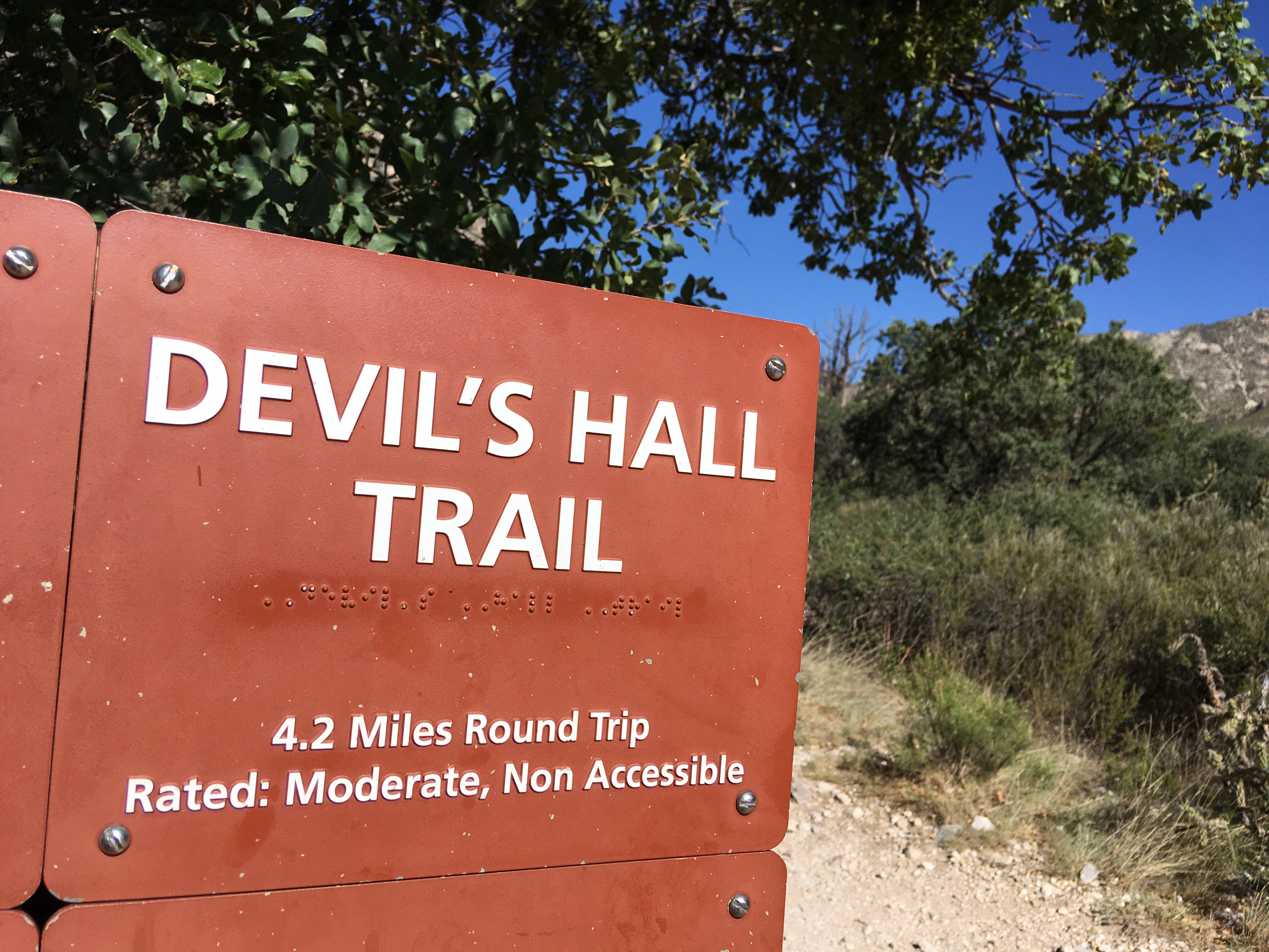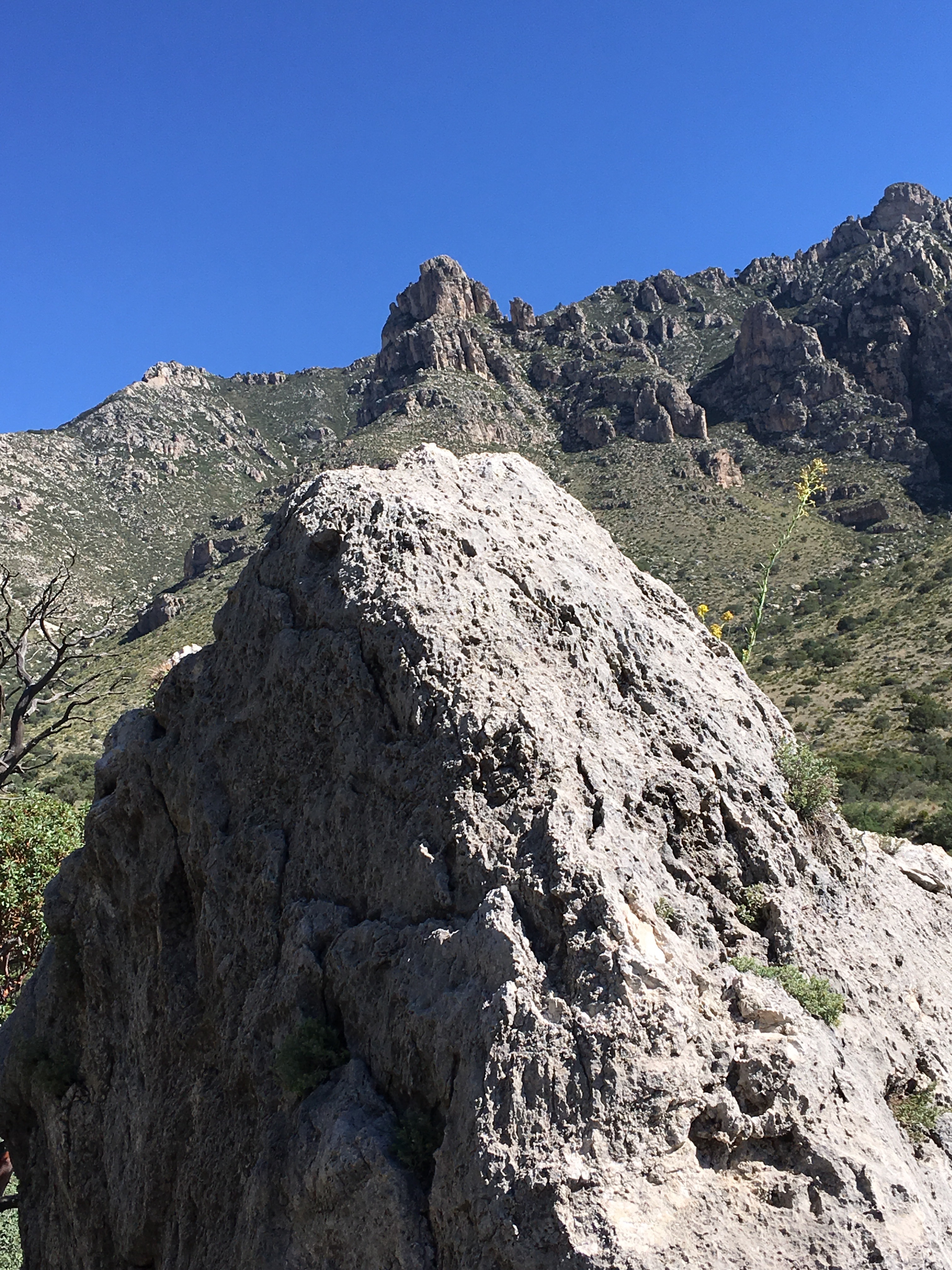 We drove a little over an hour southbound back into Texas to visit Guadalupe Mountains National Park.  (Another new NP for me.)  After filling our water bottles and getting a map at the visitor’s center, we began our 5+ mile hike to Devil’s Hall.  The hike was a basic out and back trek.  The first part of the hike was on a traditional trail which gained some elevation.  The second part of the hike had us walking through a rocky wash and scrambling over rocks and boulders.   Luckily, I had two hiking poles.  We were both able to use one to help us remain steady.  At the end of the way in, we approached a natural staircase which led to the trail’s namesake.  We snapped several photos, ate a snack, and turned around to hike back down.