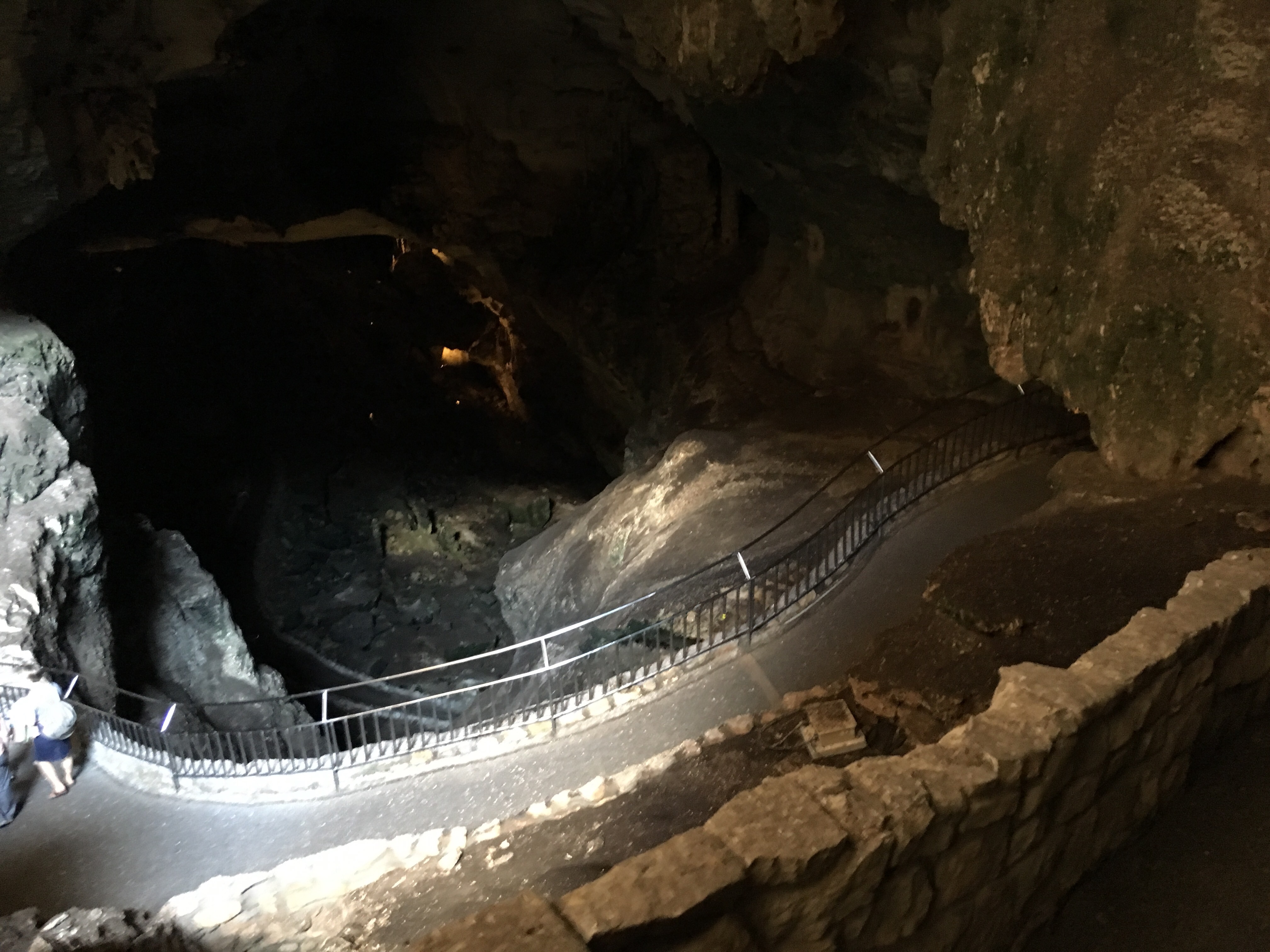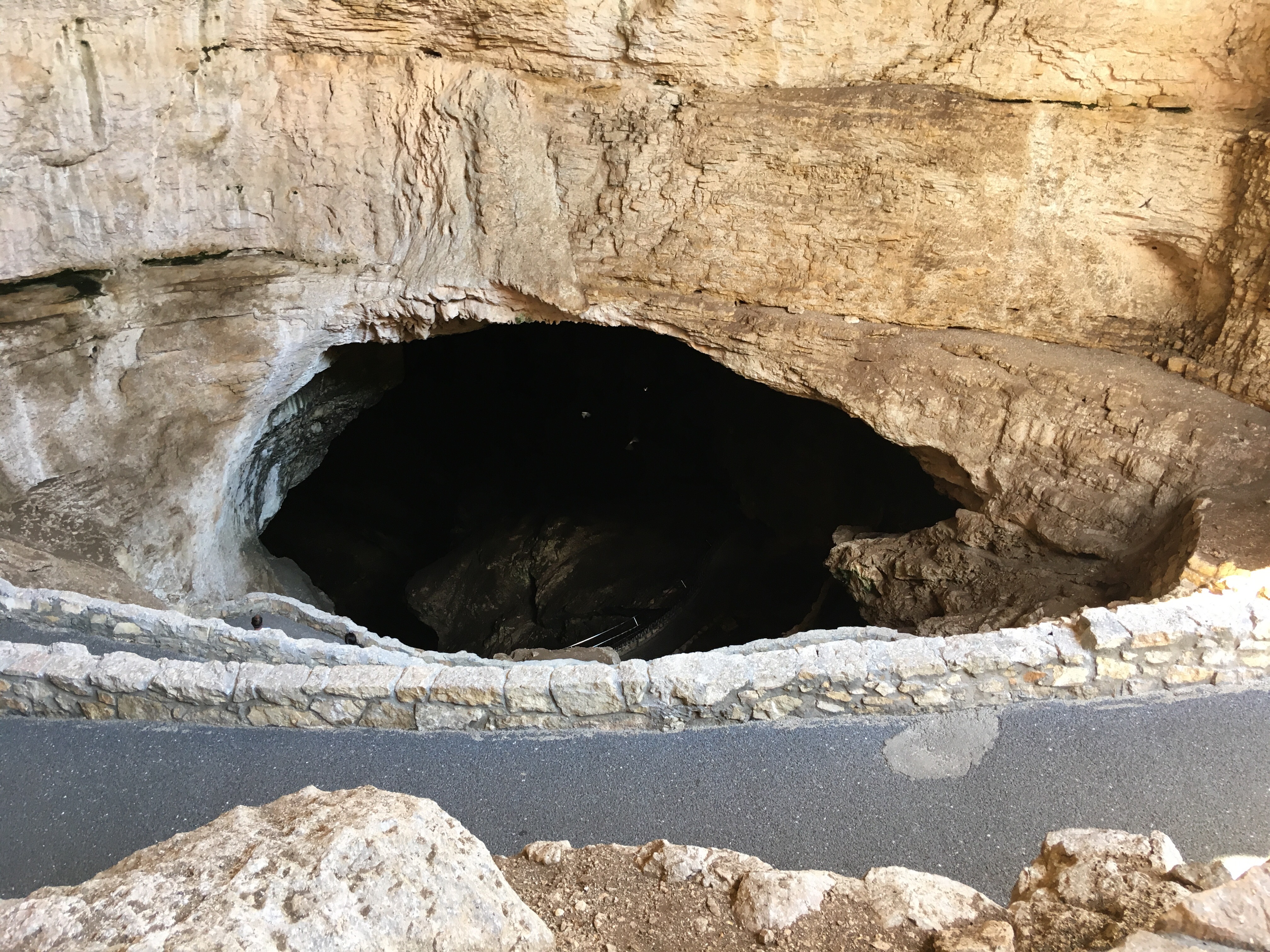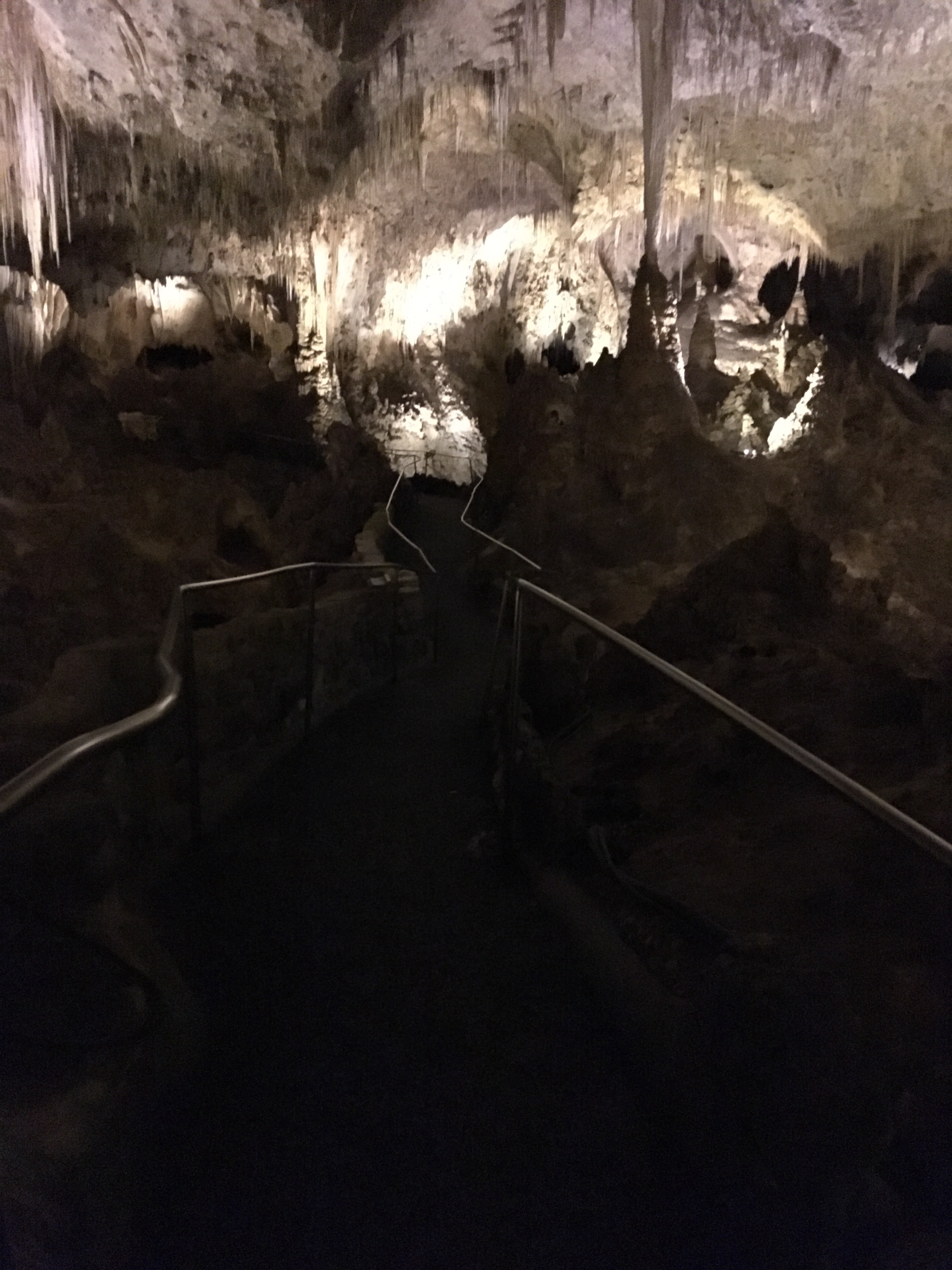 When we arrived at Carlsbad Caverns, we showed our Park pass to get tickets for the self guided tour.   I wasn’t exactly sure how different the cave would be compared to Mammoth Caves.  Although there were some similarities, Carlsbad Caverns was much grander and jaw-dropping.  The beginning part of the hike was walking past the amphitheater where we planned on watching the bat flight in a few hours.  From there, we could see the natural opening to the cave.  Birds were flying all around and diving into the cave around this point.  Despite some very close calls, no cave swallows managed to successfully target us with their droppings.  The cave immediately required us to descend into it using the very many switchbacks.  The railings proved useful, as many parts were slippery.  Honestly, the cave seemed to never end as we made our way towards the 750 foot mark that we would eventually reach.  The photos below simply do not do any real justice to the magnificence of the caverns.  At some points, the size of the open space was equivalent to several Madison Square Gardens combined!  (No joke!)  Overall, it took us nearly two hours to hike to bottom and complete the mile loop around the Big Room portion of the cave.
