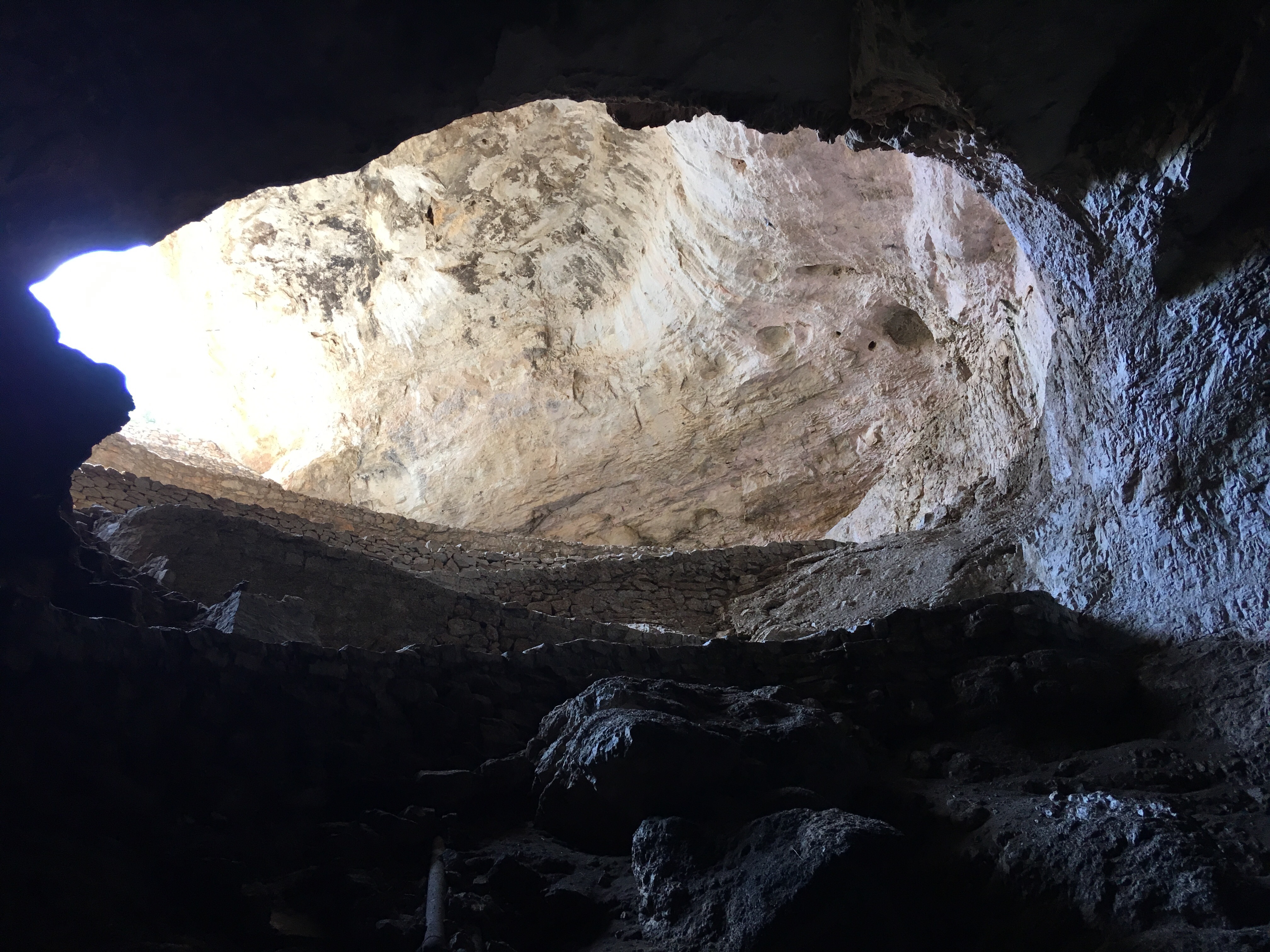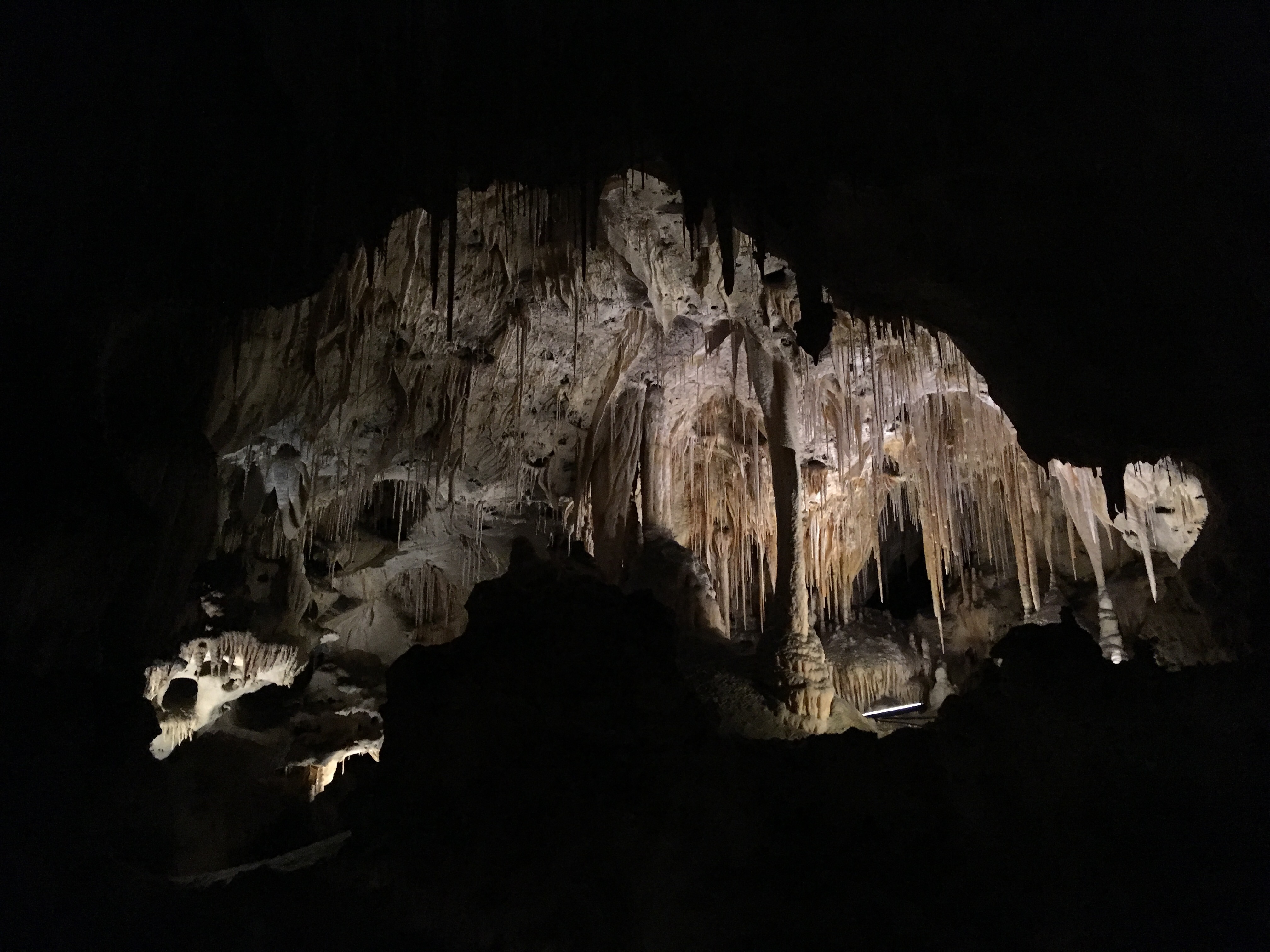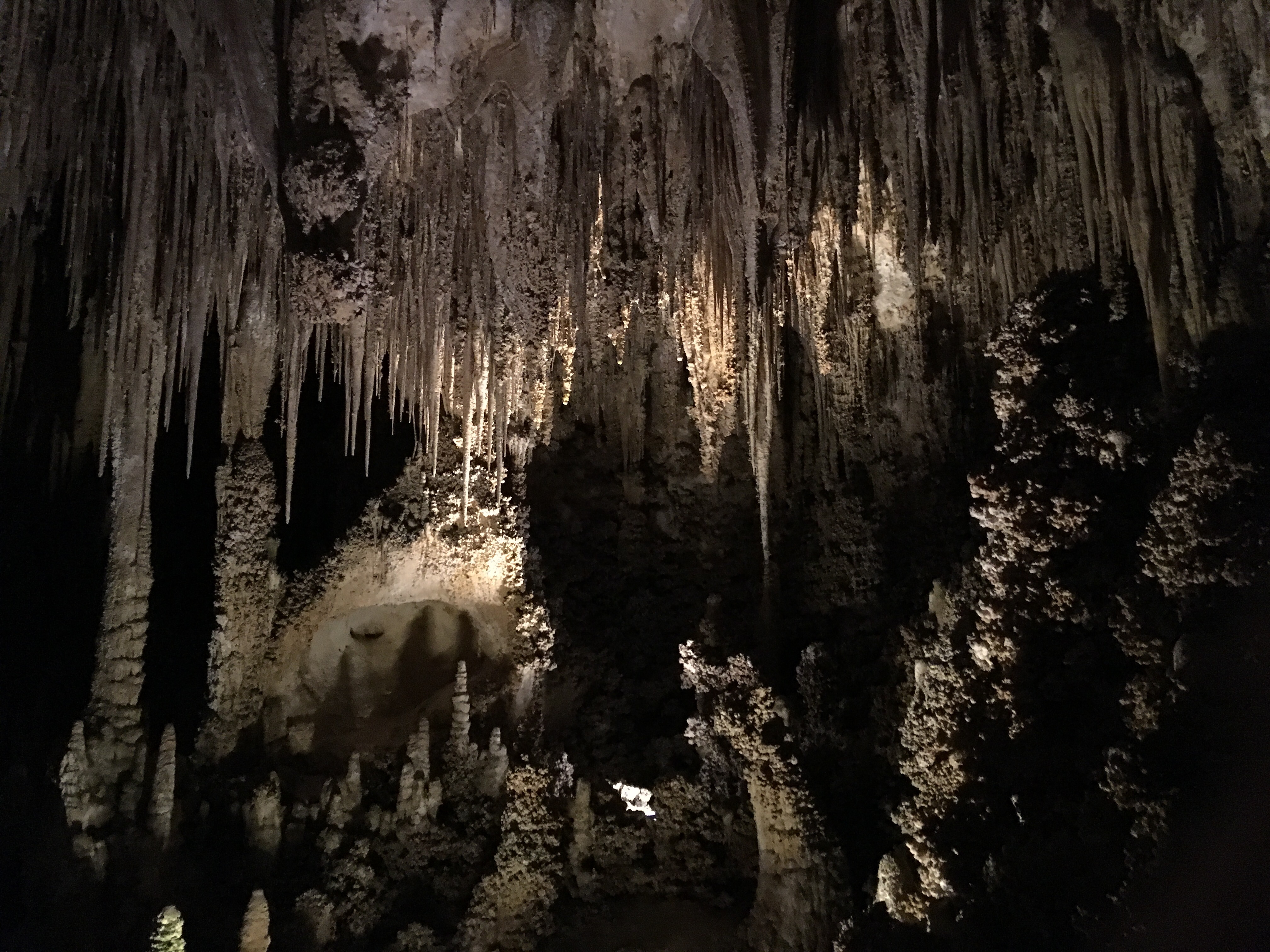 When we arrived at Carlsbad Caverns, we showed our Park pass to get tickets for the self guided tour.   I wasn’t exactly sure how different the cave would be compared to Mammoth Caves.  Although there were some similarities, Carlsbad Caverns was much grander and jaw-dropping.  The beginning part of the hike was walking past the amphitheater where we planned on watching the bat flight in a few hours.  From there, we could see the natural opening to the cave.  Birds were flying all around and diving into the cave around this point.  Despite some very close calls, no cave swallows managed to successfully target us with their droppings.  The cave immediately required us to descend into it using the very many switchbacks.  The railings proved useful, as many parts were slippery.  Honestly, the cave seemed to never end as we made our way towards the 750 foot mark that we would eventually reach.  The photos below simply do not do any real justice to the magnificence of the caverns.  At some points, the size of the open space was equivalent to several Madison Square Gardens combined!  (No joke!)  Overall, it took us nearly two hours to hike to bottom and complete the mile loop around the Big Room portion of the cave.
