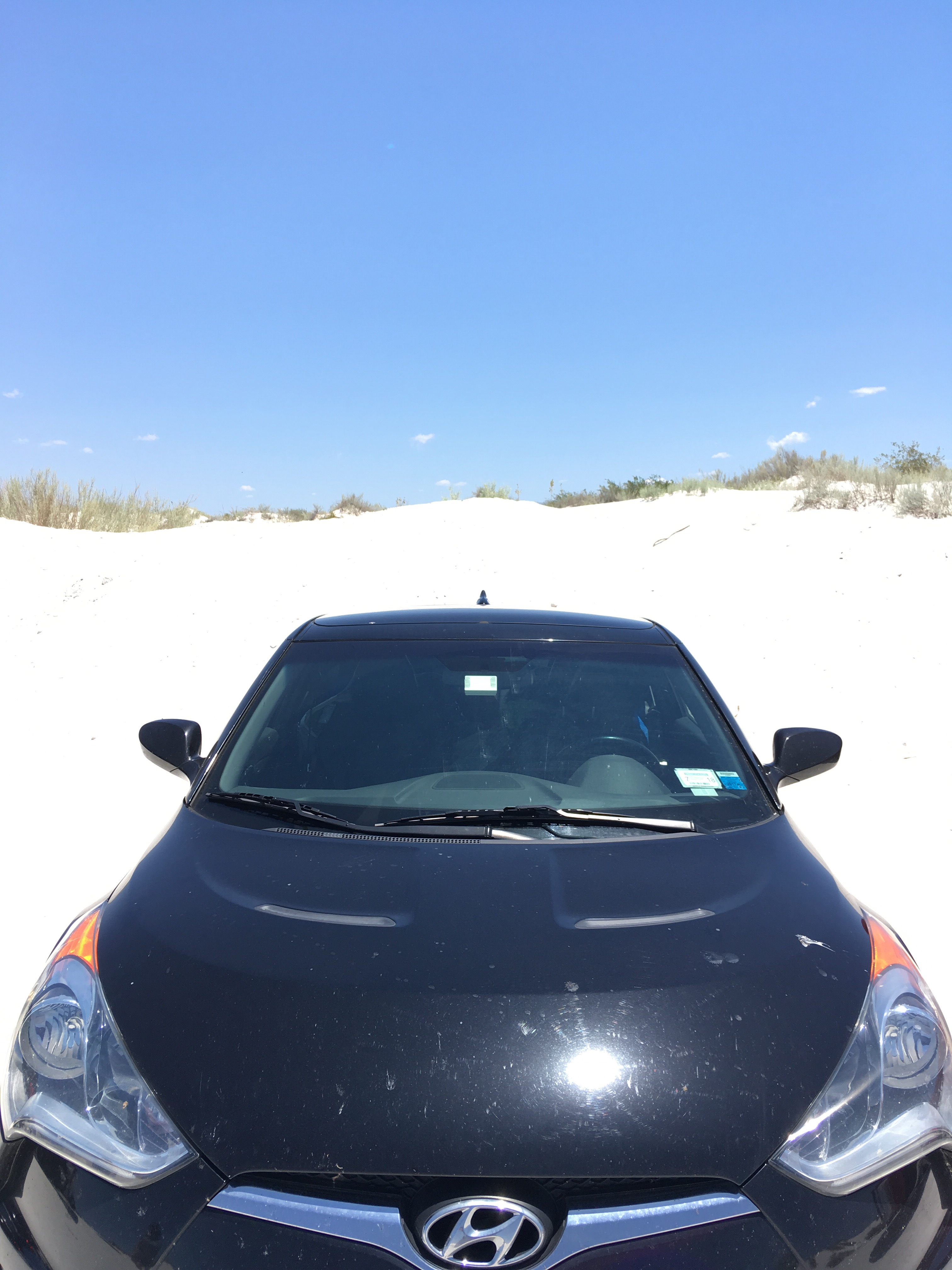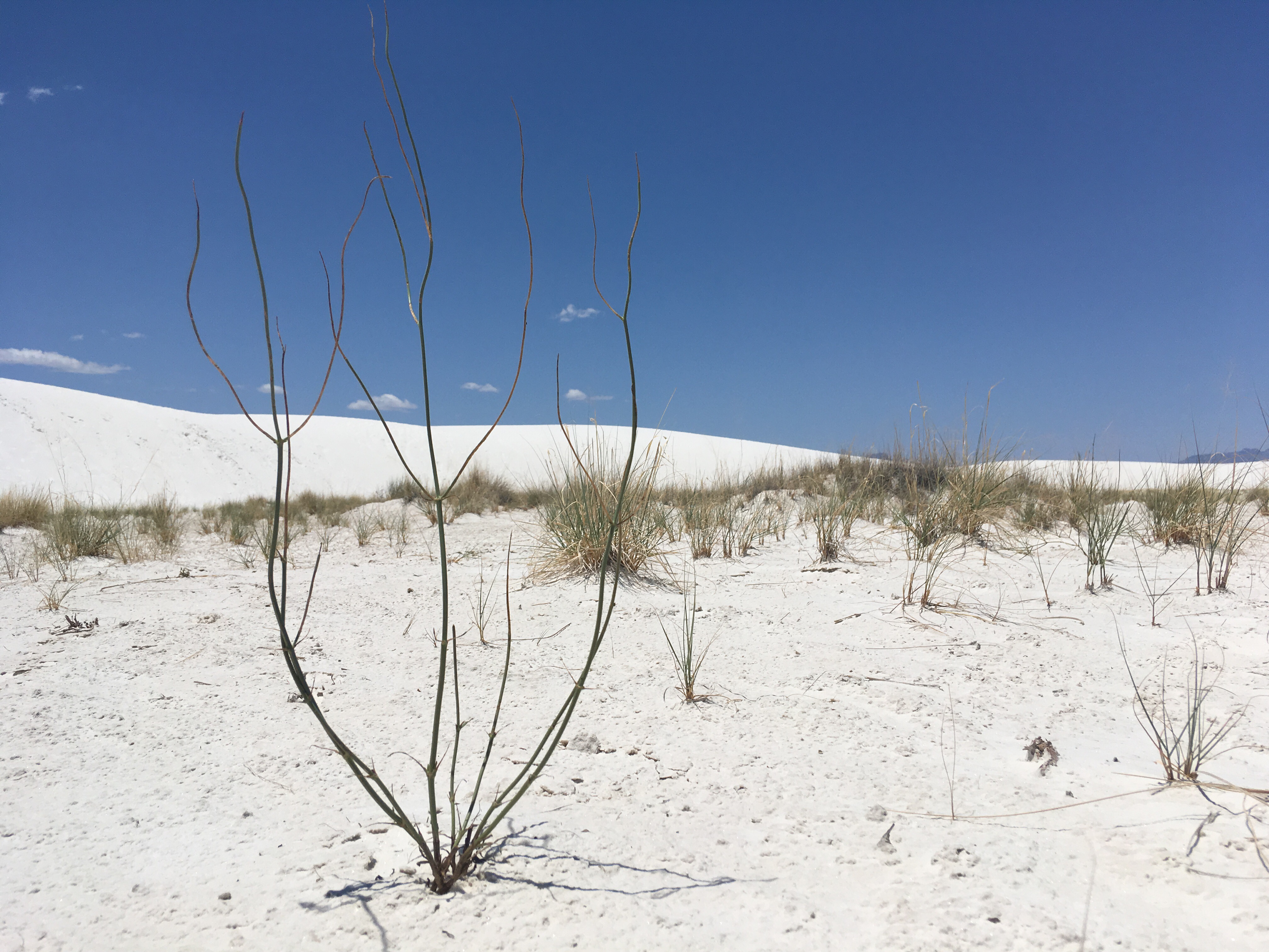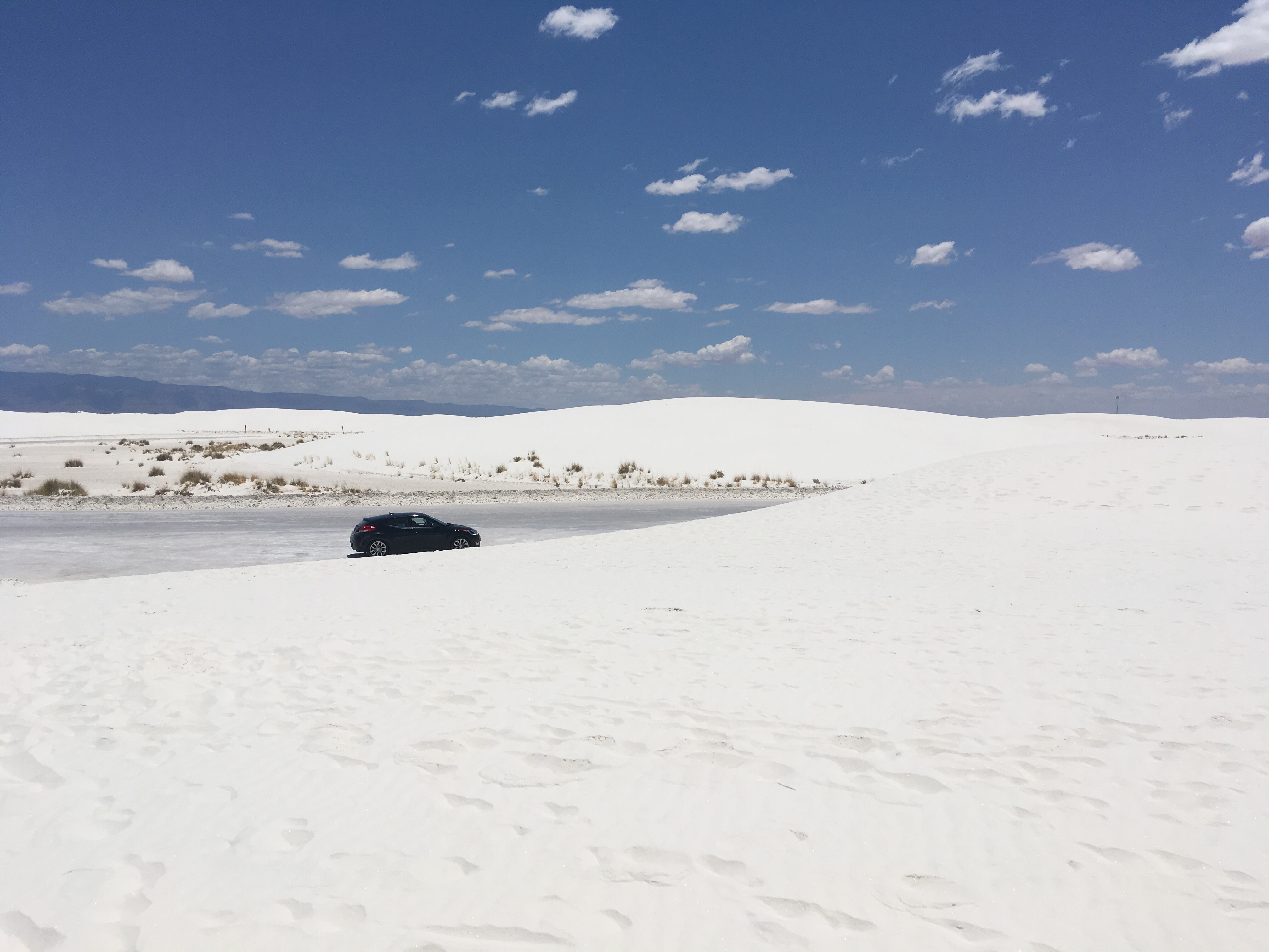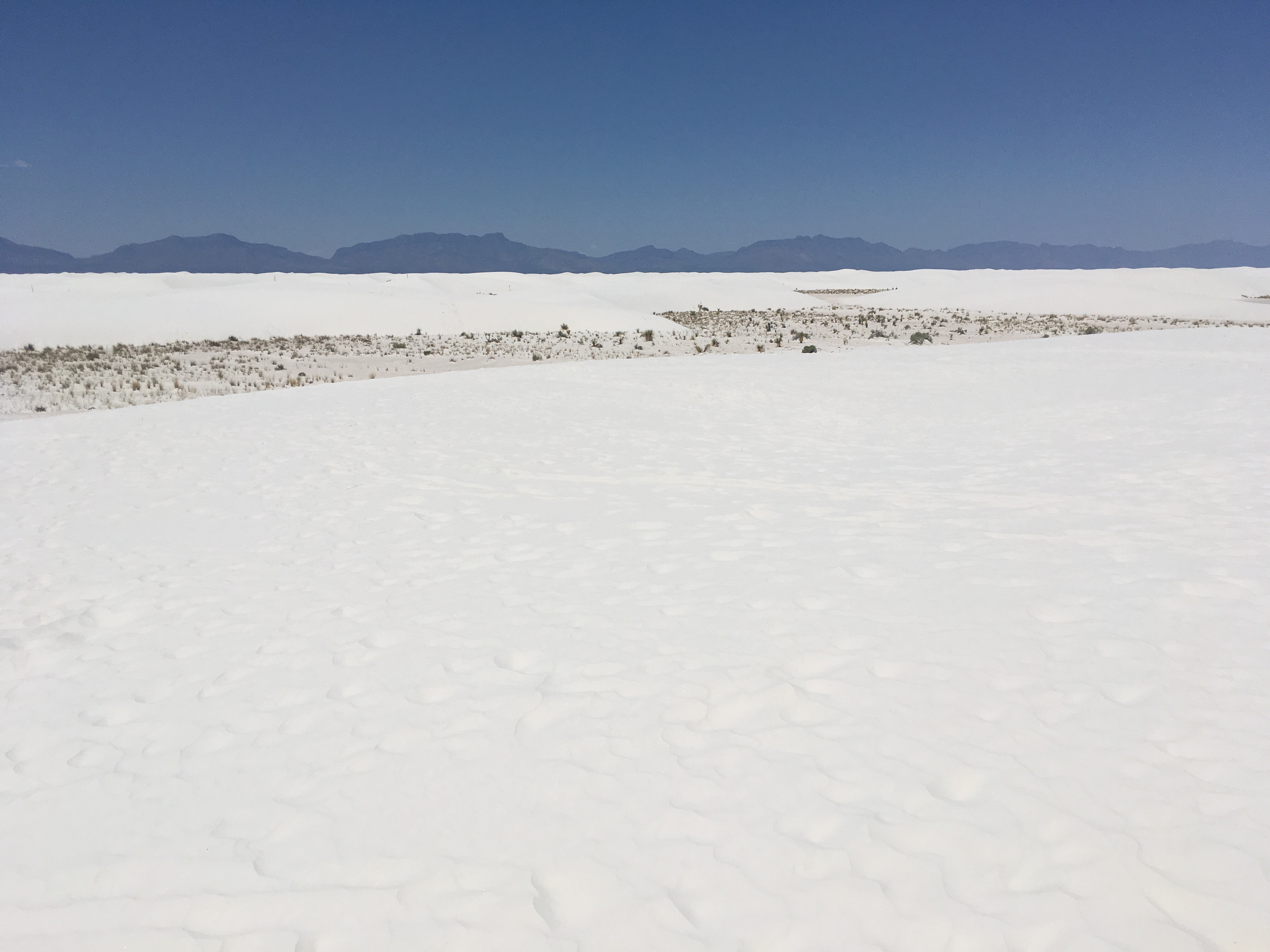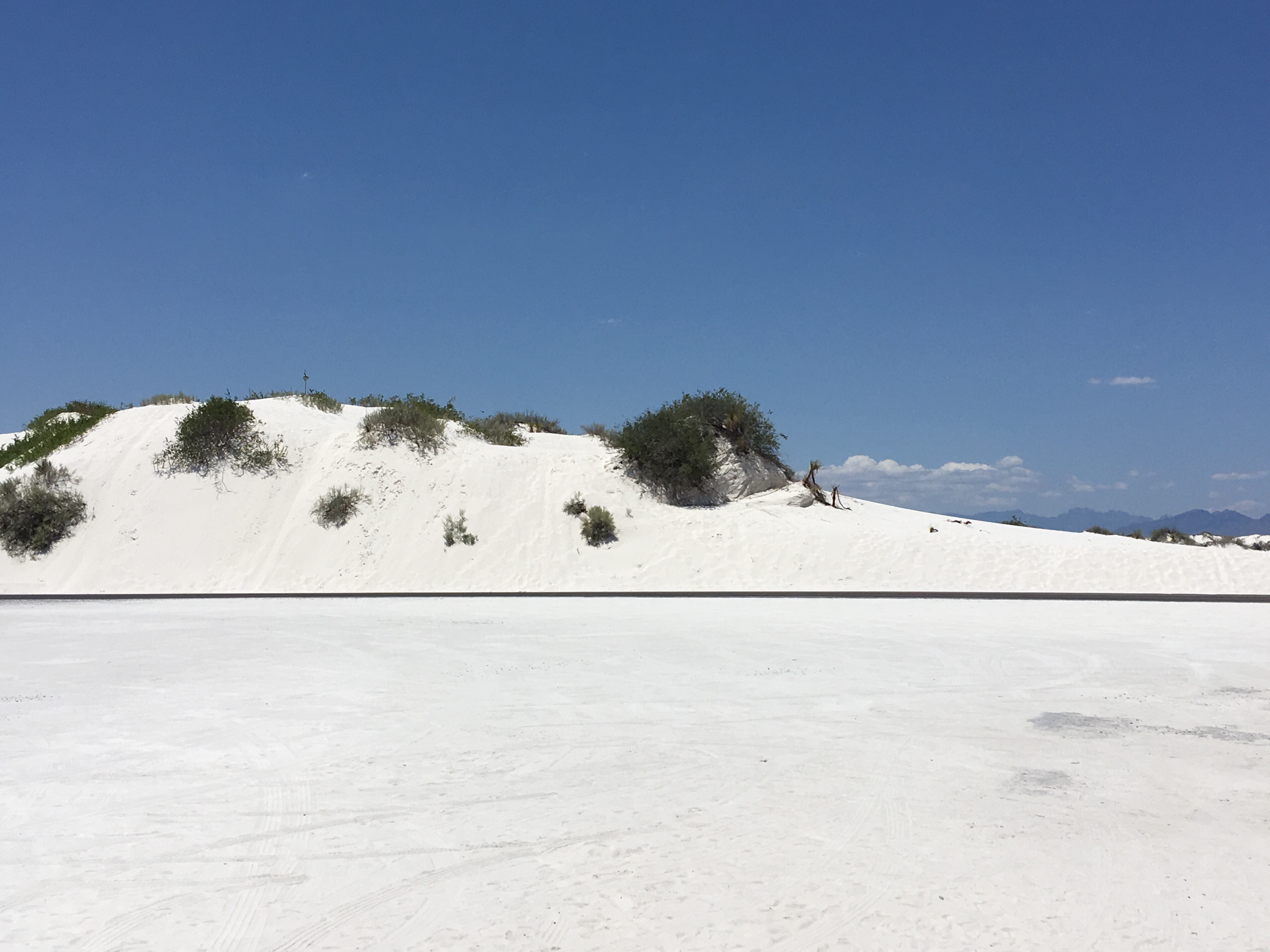 :  We woke up and broke down camp before making our way towards White Sands National Monument.  This won out over passing through Roswell, NM.  I’m so glad it did!  The hour or two we spent there was fascinating.  We drove along roads that were covered by the white sand, which is actually finely eroded gypsum.  We climbed the dunes and saw incredible views.  Janice met a spider friend who wanted to hang out in her shadow, while I met a lizard friend who was showing off his highly evolved sense of camouflage.