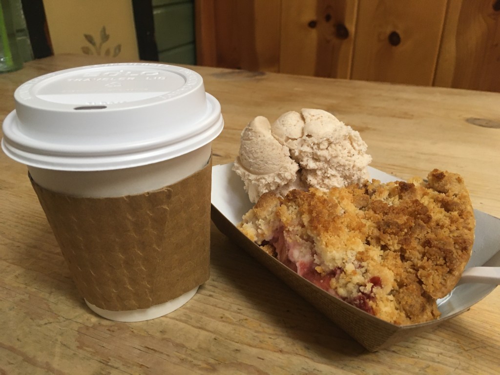Strawberry-Rhubarb with Cinnamon ice cream/ Hot Cider (Thanks, Mom’s Pies!)