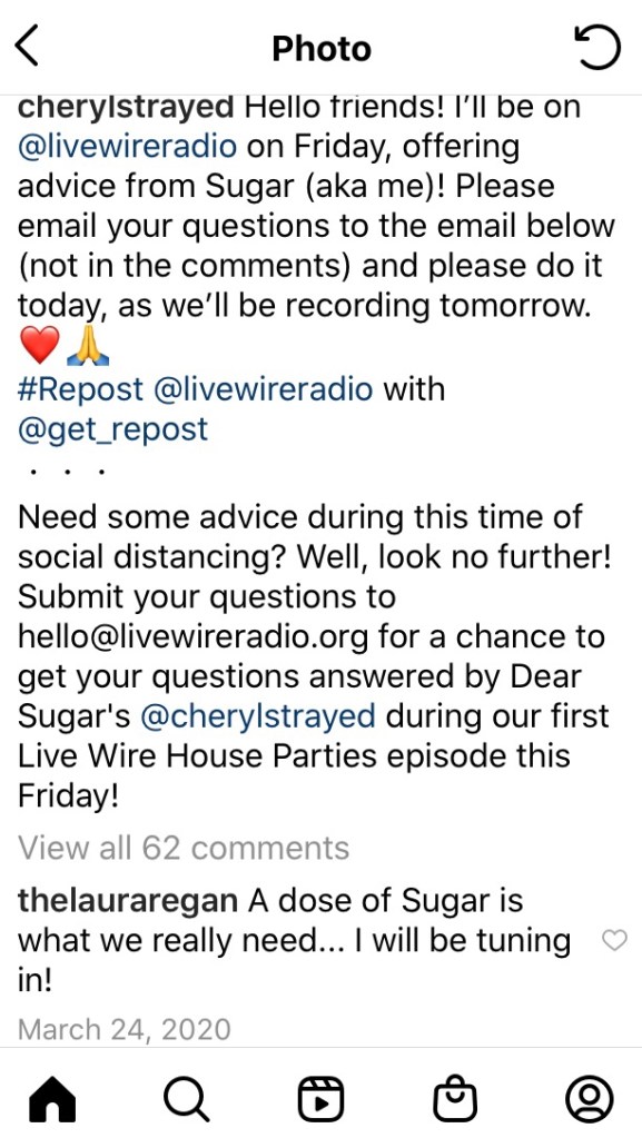 *The radio broadcast from March 27, 2020 where my question is answered can be found wherever one searches for podcasts. Cheryl Strayed begins answering questions around the 30-minute mark of the episode. The name of the podcast can be found at the very end of this post.