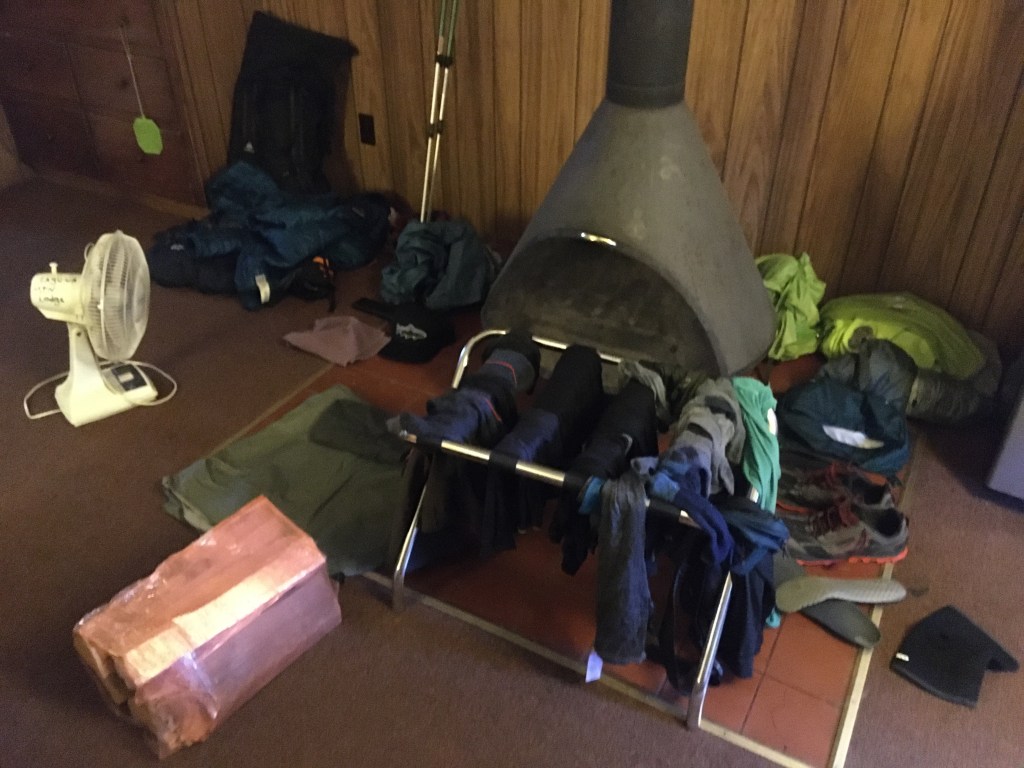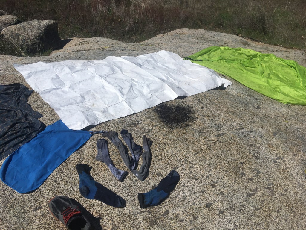 The following afternoon, when Wolverine and I were walking back from the Malt Shop in the rain, I noticed Justin walking towards us. We said hello, and said we’d chat more back at the campground later on. The rain intensified, and I found myself resting in the dry environment of my tent for quite awhile. At some point, I heard a voice ask if I wanted to share a room at the Lodge two days down the trail to lessen the cost. That worked for me. The next morning, Justin and I hiked out of Lake Morena together, discussing our hiking experiences along the way. Around the time that we were getting hungry for lunch, a giant boulder appeared, and Justin introduced me to the phrase “yard sale” as it pertained to hiking. Our sprawled-out drenched gear needed less than an hour to become bone dry under the bright sun. Later that day, I called ahead to the Mount Laguna Lodge to book a room in advance. (Once a teacher, always a teacher.) It was a good thing I did. By the time I arrived the next day barely able to feel my fingers and met back up with Justin who was inside of his sleeping bag sitting on a chair on the front porch, the rooms were all accounted for since the weather was dangerously cold. Once again, all of our belongings were spread out in an attempt to dry them off. This time the process took place indoors. The opportunity to regroup before returning to the trail was greatly needed. During our stay, we continued to get to know each other. During this time, Justin gave me pointers about trail life that would certainly be helpful.