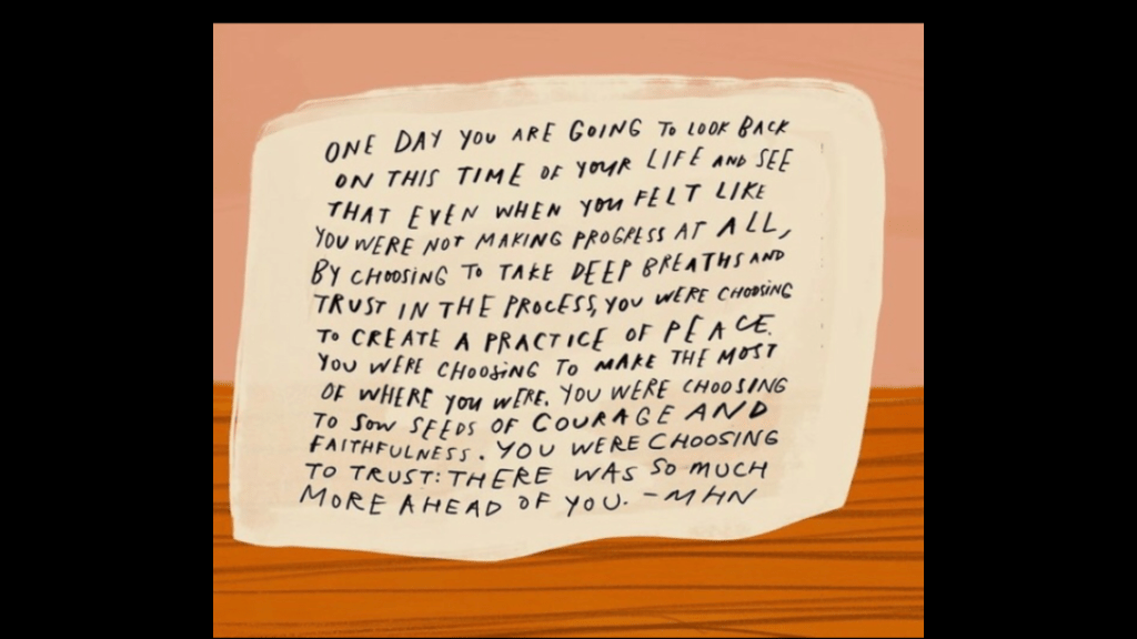 After our hike, we decided to grab a bite to eat. While I was waiting for their arrival at the restaurant, I read a message that had just been sent from the “Mindful Moments” group that Stefanie created years ago. She shares these moments of mindfulness from time to time through a digital platform. The bits of wisdom shared always provide a gentle reminder and a spark of inspiration when they arrive. The push notification appeared on my phone while on the hike, but I ignored opening the message in the moment to avoid being rude. For context, the previous “Mindful Moment” message had been sent just over two months earlier. Timing is everything. The winks offered up from the universe continue to amaze me. The message that arrived at the exact moment my friend and I were discussing the current state of our lives was this quote by Morgan Harper Nichols: